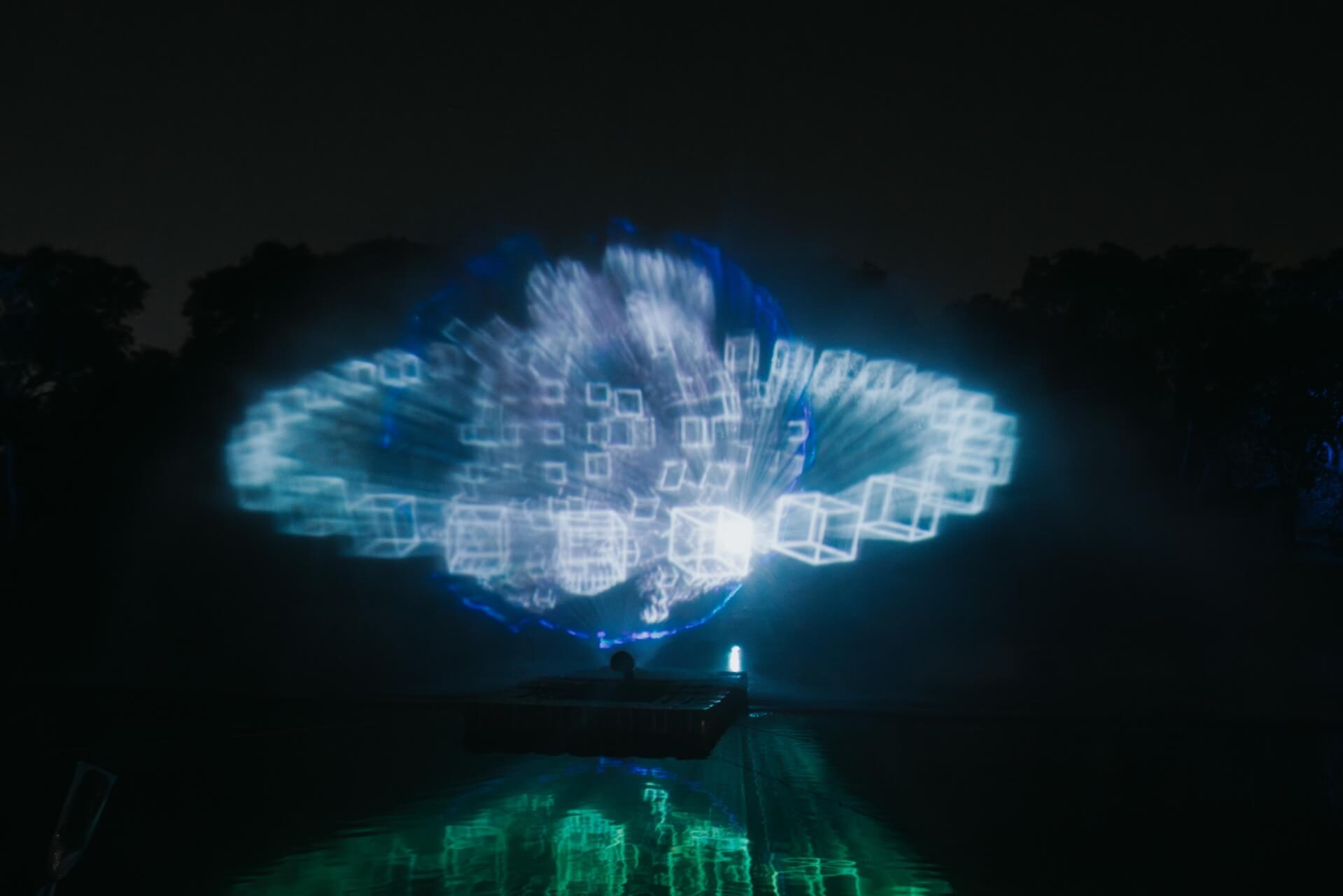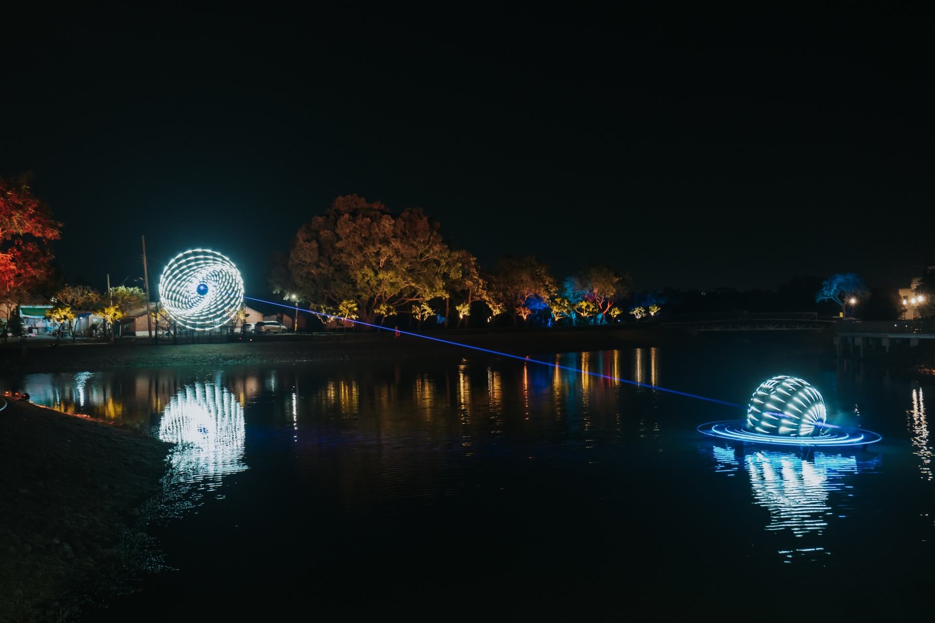而在《無盡光輪》中心點的一道藍色光線,連結至水面上的《光核》 ,《光核》以光建構如核心般的球體,如種子般從天而降準備落地深根,亦如奇幻電影的場景彷彿未知的生物造訪;傳達許多事物的成果,常是起始於一個極微小的開始,進而激起無限的漣漪,如同月津港燈節一般。