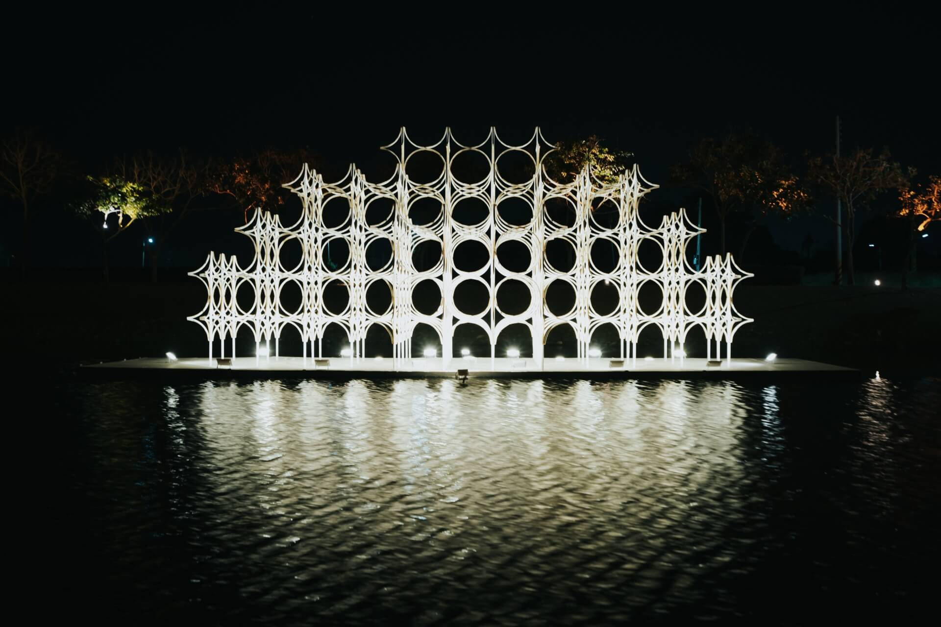由藝術家王俊淵、楊閔棣共同完成的《泡泡》,獨特優雅的幾何結構佇立於水面上,從白天到黑夜觀賞都有不同美感。《泡泡》想傳達的是道家中「炁ㄑㄧˋ」的概念,炁是道家所謂的生命最根本元素,永恆不滅,以光的形式浮游於宇宙之間,若降臨在地球上,它將以泡泡的方式飄盪於地球的每個角落,或在雲間、或在水裡……每個泡泡都孕育著生命,並寄託於萬物載體。