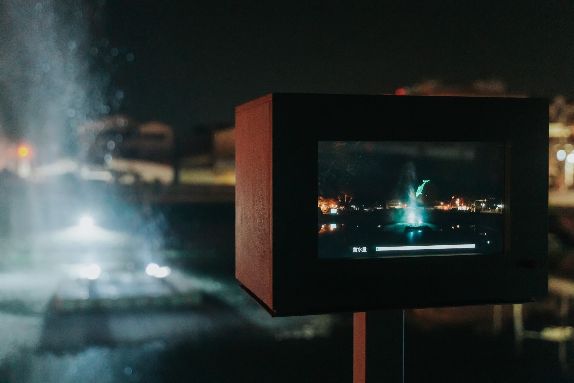 這組有趣的互動裝置《光的瞬間造就記憶的偶然》,在岸邊安裝了一組上頭有按鈕的螢幕,按下按鈕後,水面上的裝置將噴出蓄積的水量,而螢幕上呈現裝置噴水畫面之餘,還多了一隻虛擬的海豚。