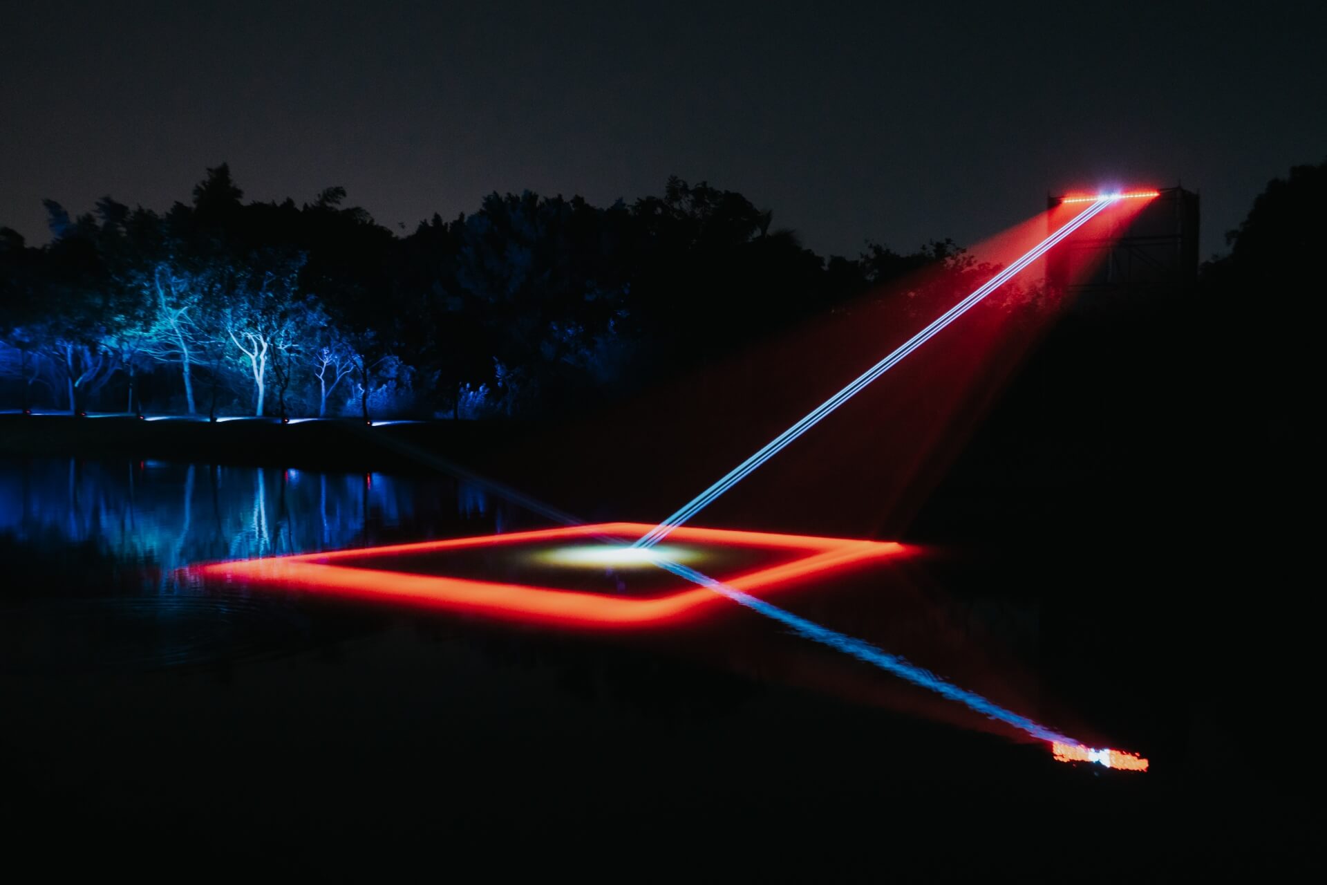 藝術家張方禹為2025年月津港燈節帶來的版本,是將光線的量體減化至由上而下墜落的狀態,藉由光與水折射、反射的物理特性,讓聚合的光束被水面介質解構成光譜。