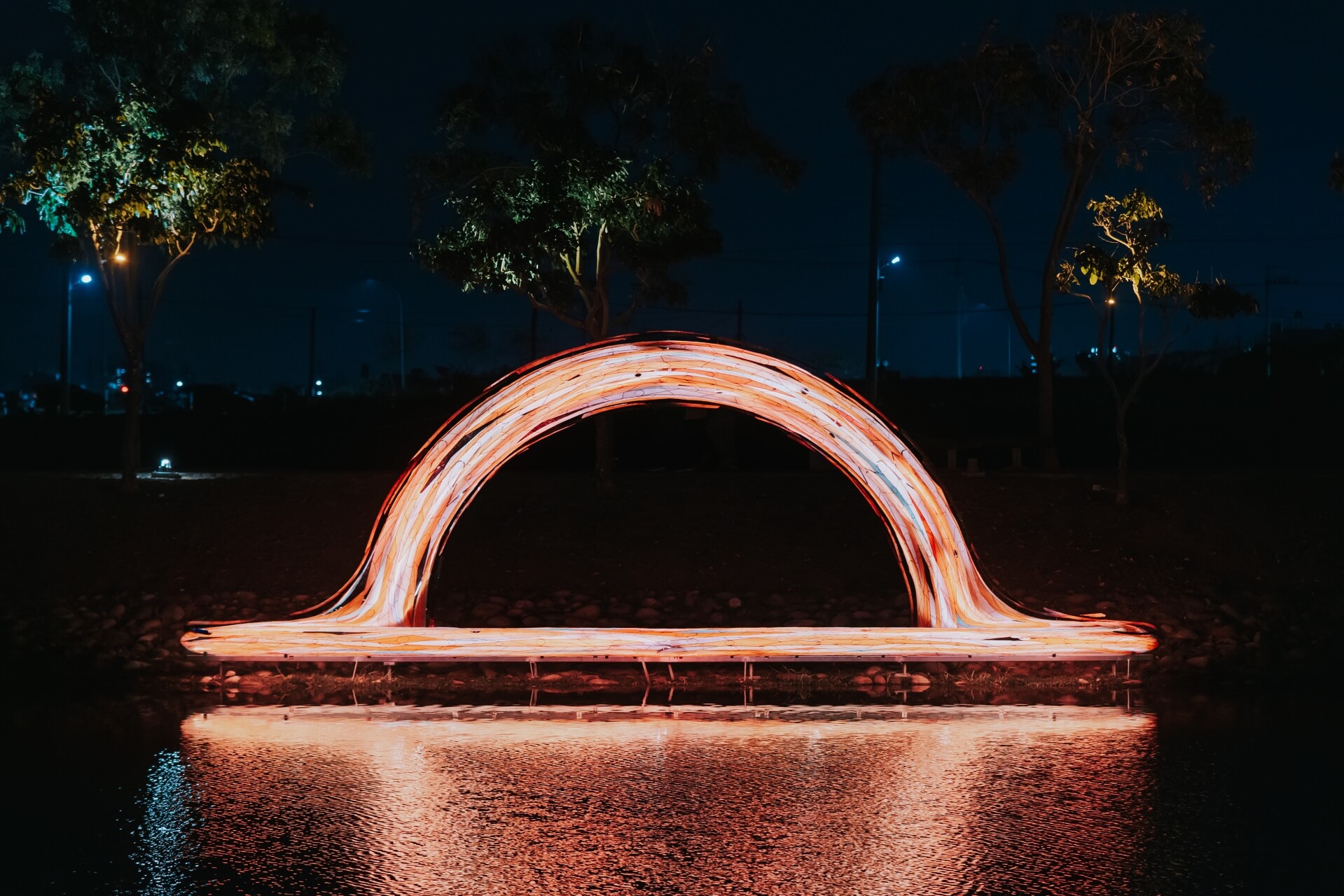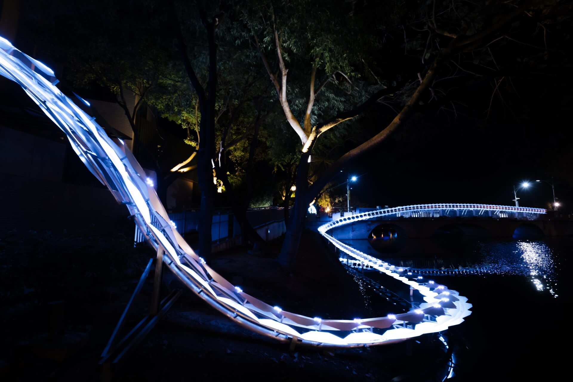 《一抹勻月光》與燈節主要幹道水月橋緊密結合,作品沿著橋的輪廓,勾勒成一道細長且勻稱的曲線,緩緩順著橋緣而下,輕輕碰觸著水岸再順勢而上。行經作品的人們,可感受到月光最後幻化成這奇幻水域的入口。