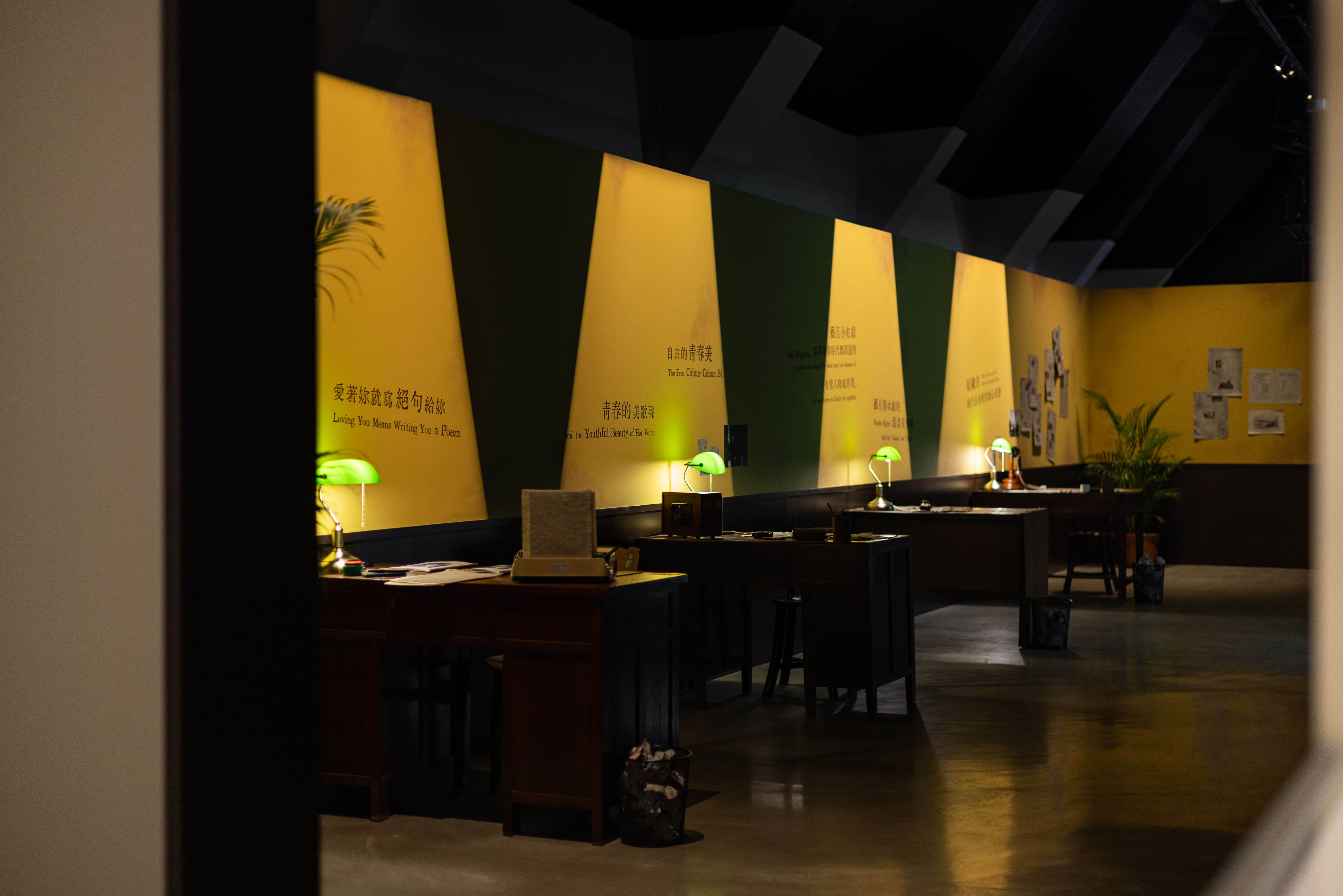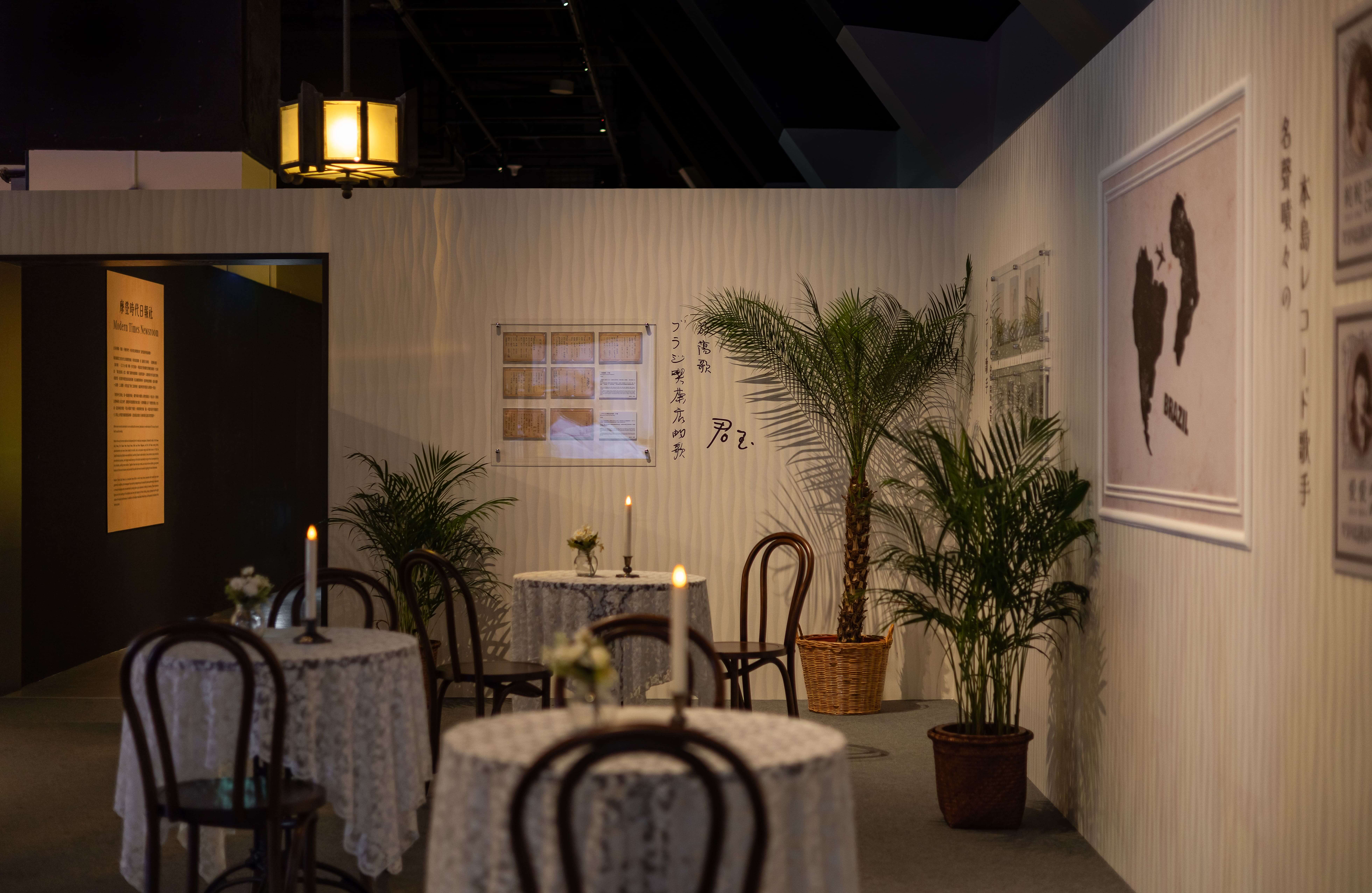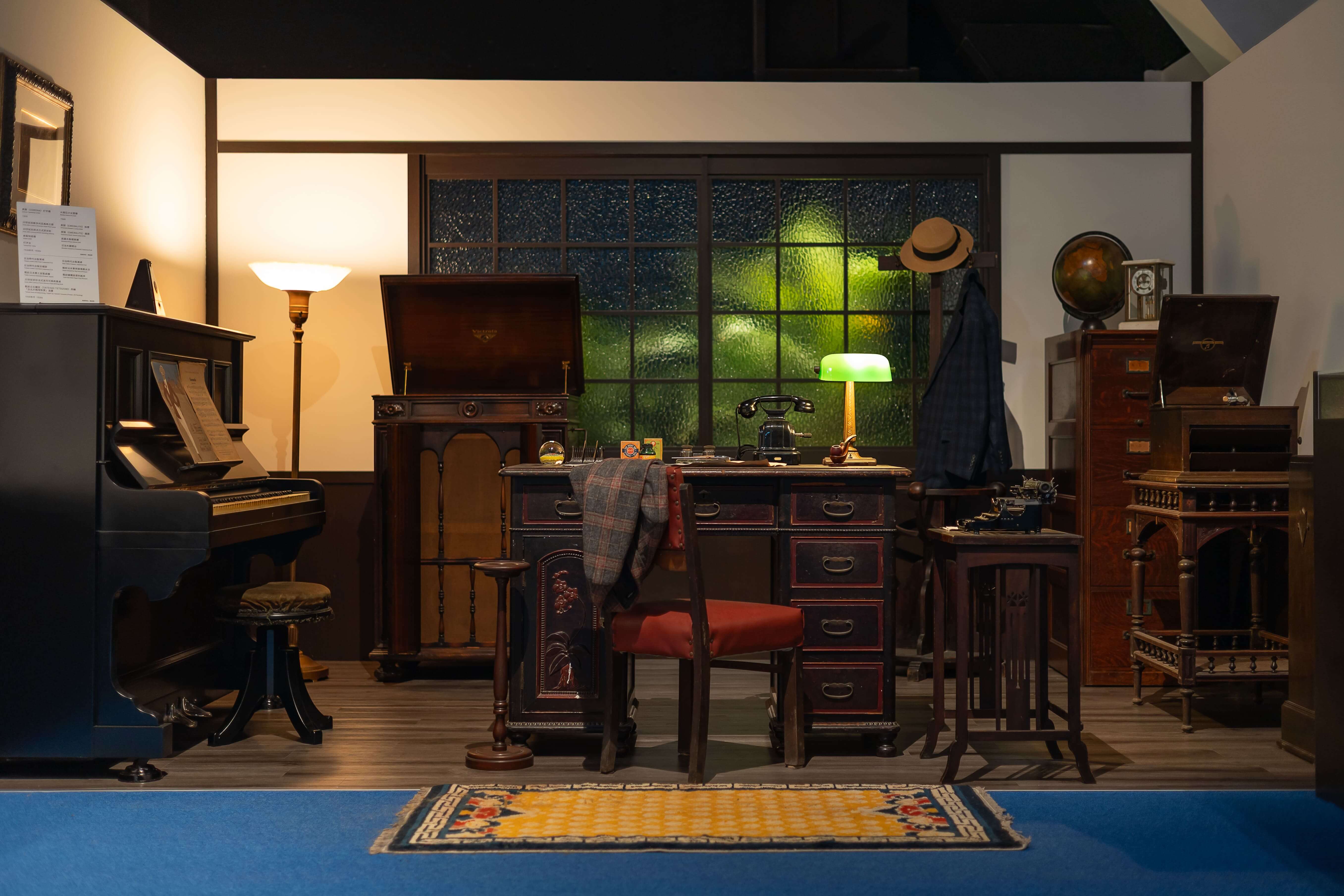 穿行沙龍的喧囂之際,第三進的空間轉為靜謐。窗景中的銀波花玻璃泛著月光映出搖曳的樹影滲入眼前。 往昔歌壇的幕後要角,製作人或詞曲創作者的工作場景【製作人記憶書房】細緻登場,臺灣第一位製作人陳君玉與臺灣歌謠之父鄧雨賢的珍貴影像與手稿,佐以藏家陳延寧收藏的老物件佈置,細膩模擬當時的創作現場。〈月夜愁〉、〈望春風〉、〈四季紅〉、〈雨夜花〉等經典作品,悄然萌芽,標誌著本地流行音樂的第一個高峰。