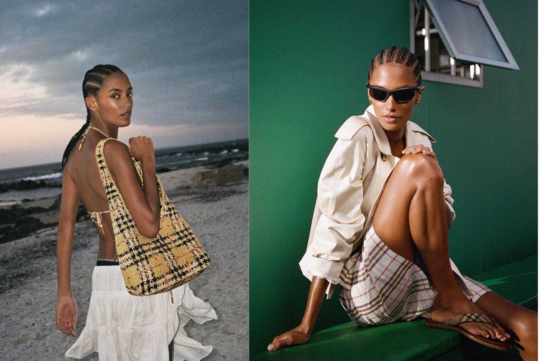 配件方面,Burberry 展示了對傳統工藝的敬意。Margate 包款由馬達加斯加工匠全手工製作,選用天然酒椰棕櫚葉染製格紋,那份帶有原始溫度卻細膩的質地,是機器生產無法取代的職人精神。