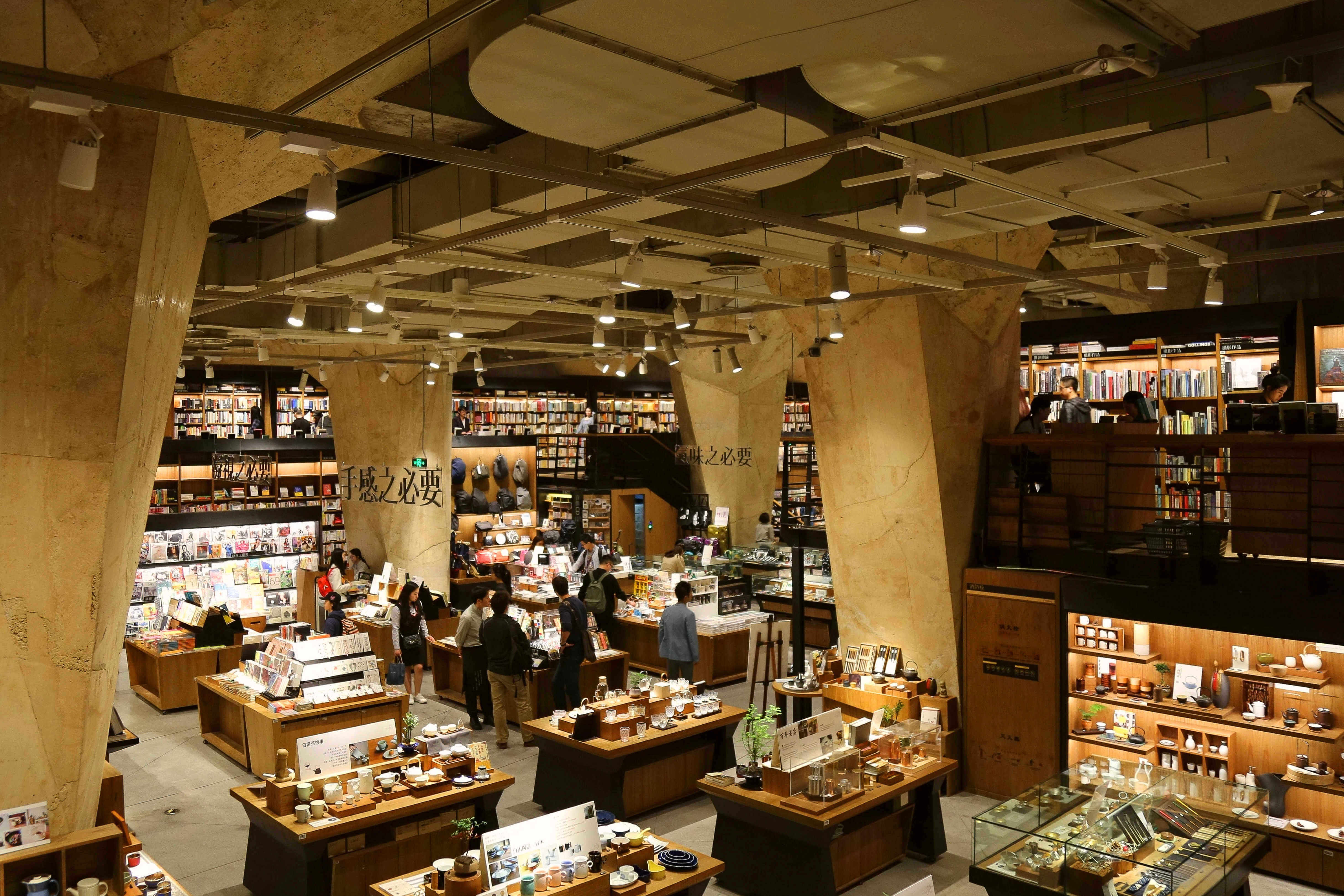 2015年,方所在成都開幕,設計委託台灣設計師朱志康操刀。選址的大慈寺商圈有一個特殊的歷史重量:大慈寺是唐代玄奘法師出家的地方。朱志康沿著這個線索往下走,把整間書店設計為大型地下藏經閣,選用木、竹、石、布、紙和金屬,造出高聳的鐵鑄柱體與錯落的書架群,光線從頂部漫射而下,整個空間有種幽深的厚重感,卻又平靜得讓人想在那裡坐很久。