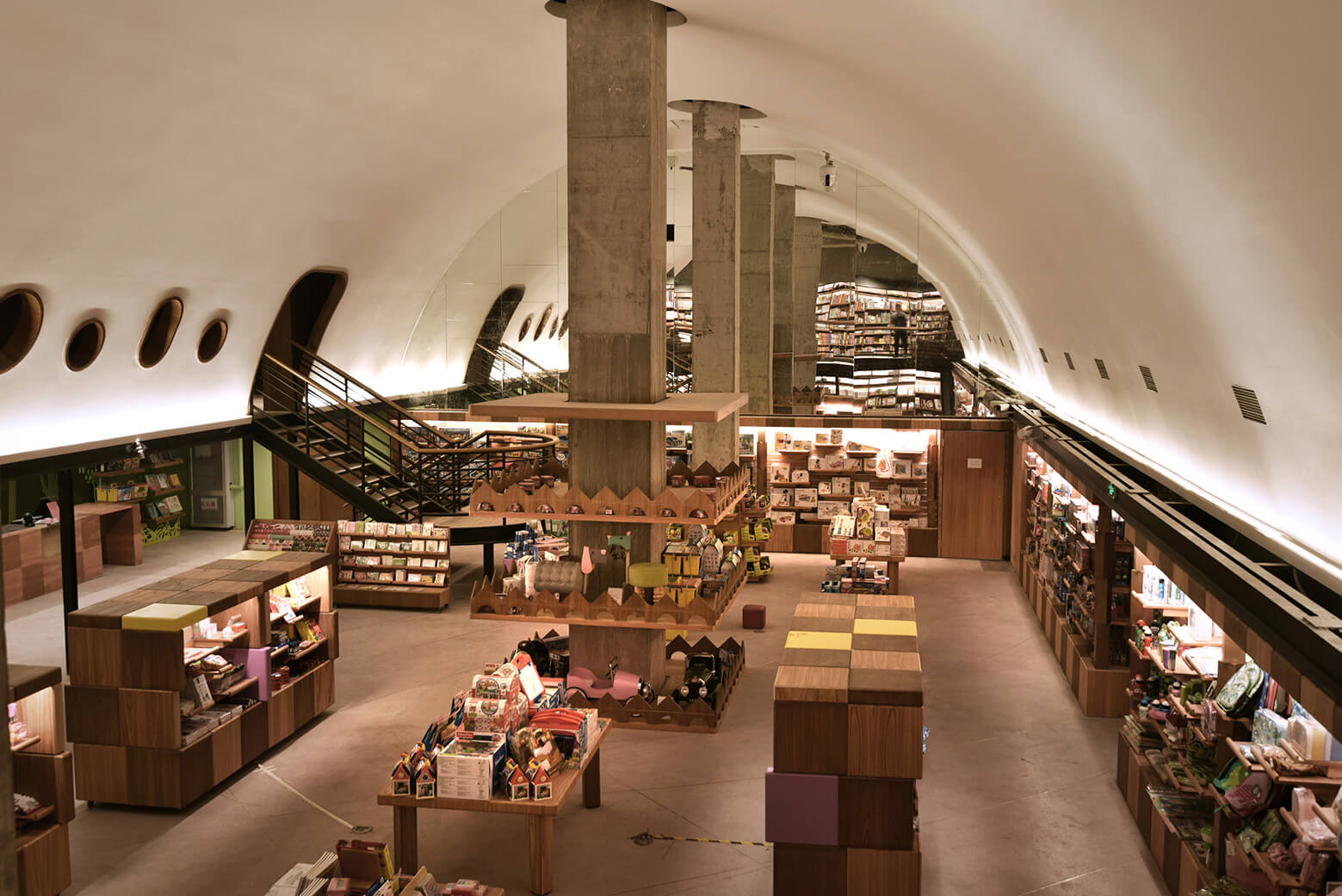 進入重慶之後,方所沿用同一套「讓城市說話」的設計邏輯,但語言完全不同。重慶是山城,地形複雜,市區本身就充滿坡道、崖壁與懸在半空的建築。設計團隊在書店裡複刻了這個感受:斜坡、起伏的路徑、像江岸一樣可以隨意落座的階梯,讓走在書架之間的讀者不知不覺地穿山越嶺。活動區被安排在書櫃圍繞的中心,靈感來自古羅馬的露天演講壇;親子閱讀的「小方所」則藏在迂迴斜坡的盡頭,像是獨立的山谷。