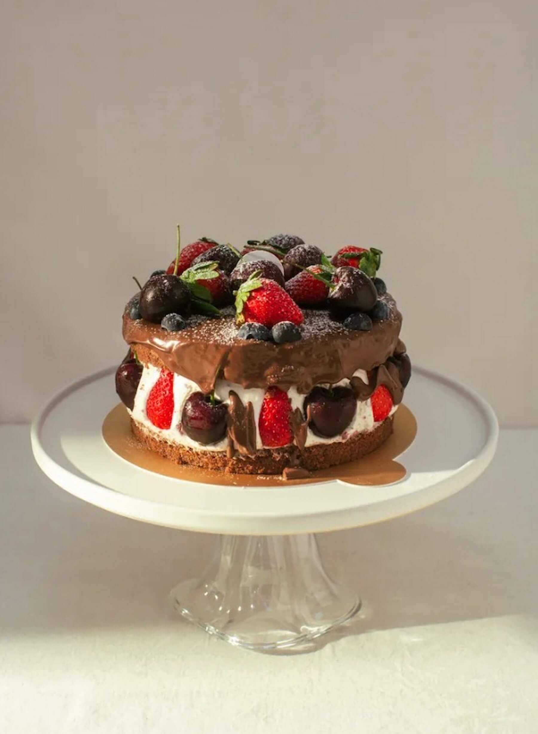 選用頂級 72% 法國苦甜黑巧克力,結合上下重磅厚切的濃醇巧克力蛋糕體,並以滑順甘納許收尾,層次深邃迷人。內餡以清爽細緻的 Mascarpone 起司為基底,拌入黑櫻桃白蘭地果肉與當季莓果,微苦中帶果香酒韻,是黑巧克力控不可錯過的成熟系甜點。