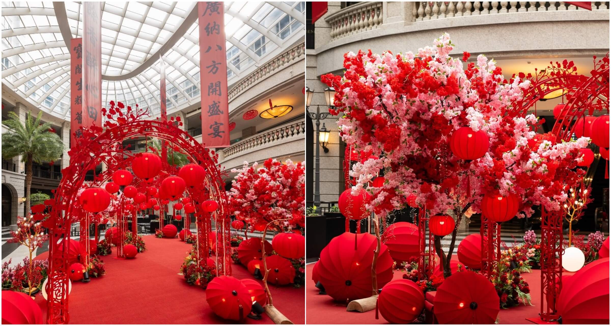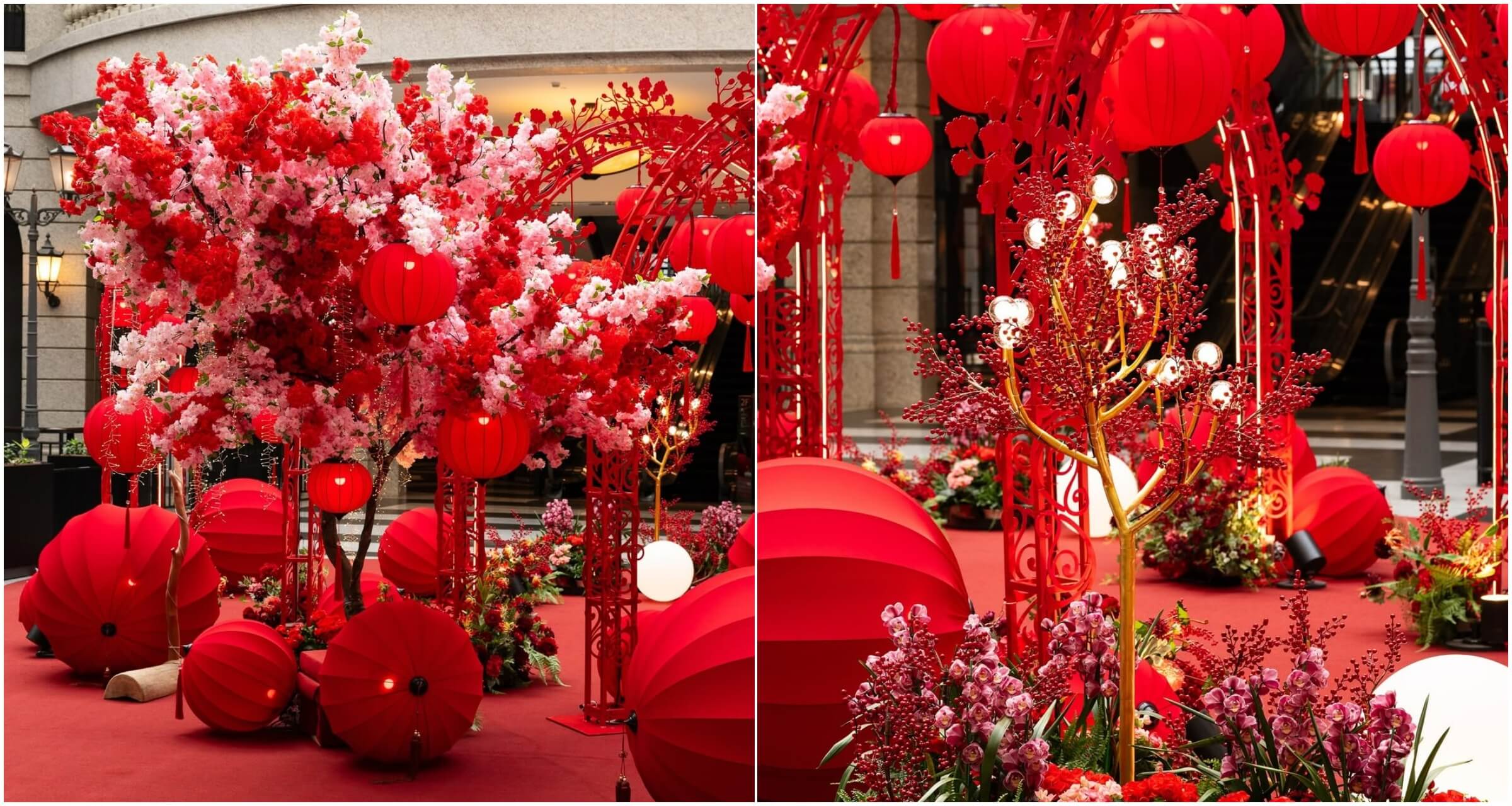 空間設計上,中庭配置六座不規則排列的紅色拱門,搭配櫻花樹、圓球燈飾與紅色地毯,營造層次分明卻不張揚的節慶動線。各樓層則以紅色獅頭與繁花鏤空飾板點綴,讓傳統年節意象轉化為更輕盈、現代的視覺語言。