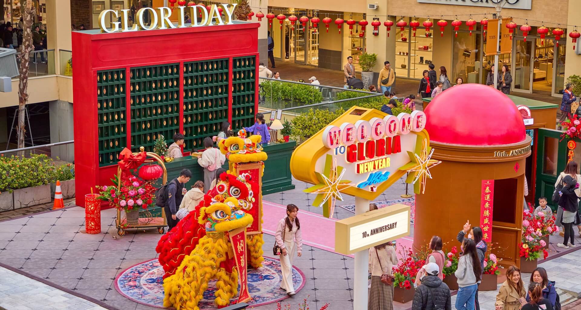 三期「Gloria麻將舞台」則有「粉紅赤兔馬」躍然登上圓形紅舞台,遊客可近距離撫摸巨馬浮雕,感受新春開運氣息。廣場上不僅有梅樹開花迎春,枝頭更繫上象徵好事將近的中國結;草地上則設置超大型麻將裝置,呼應「中、發、白」大三元吉局,寓意新年好運到位、財運齊發、開局圓滿。