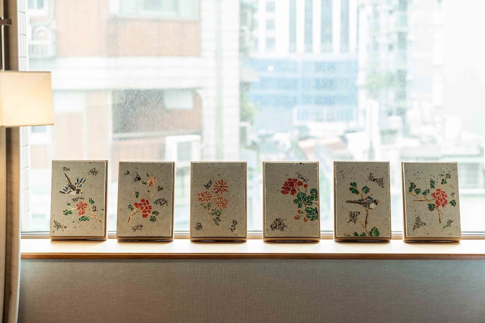 2026 ONE ART Taipei 飯店型藝博會展間一隅,第八屆「新賞獎(ONE ART Award)」入選作品之一 :廖昭豪《銅線磨石子寫生計畫-牡丹、菊、喜鵲 》(暮拉多元藝術空間)