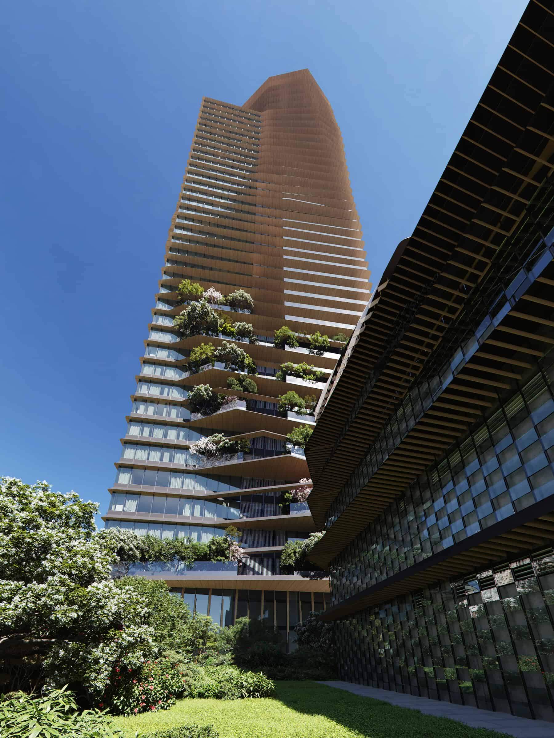 隈研吾分享,他對台灣的印象是「開放的精神」,無論是城市規劃還是建築設計,每個地區的風土和文化都不同,具有各自的多樣性。對他來說,台中是一座綠意盎然的城市,於是將「綠」作為整體設計的核心。建築外觀以層層錯落的簷板堆疊而成,木質紋理柔中帶剛,呈現有機體溫暖的律動感,大面積的玻璃開窗和深淺不一的陽台,讓人們在室內,同樣能感受到自然光影滲透的氣息。除此之外,在入口處種植一棵源於基地的老樟樹,見證此地兩百年的城市歲月,並規劃栽種台中市市花山櫻花,引入大量植栽,讓綠意垂直延伸至天空──高樓不僅僅是高樓,而是一座會呼吸的通天花園。