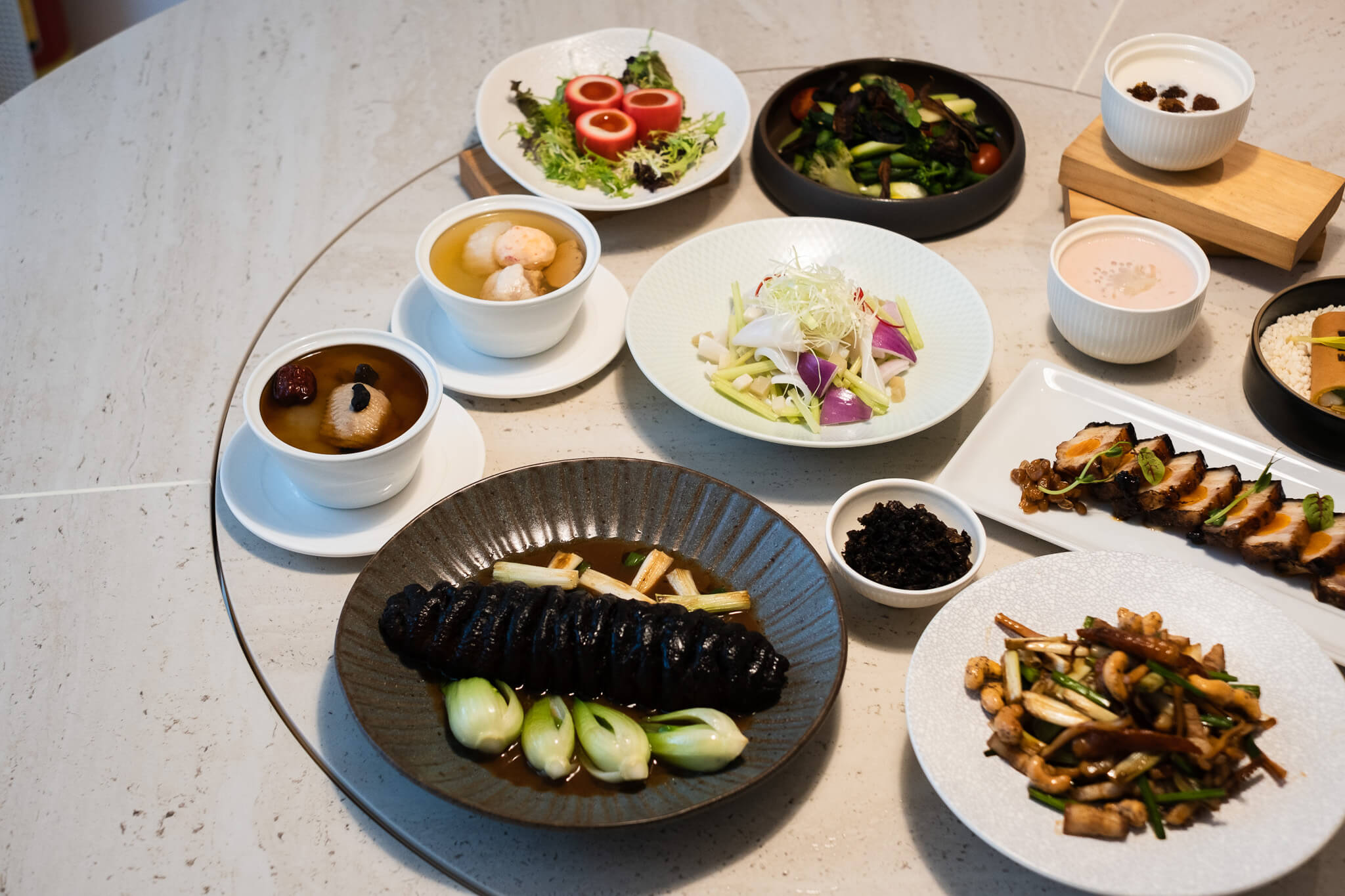 主打菜色「梅菜海參」選用厚實的豬婆參,注入彈牙的手打蝦滑後先煎熟定型,再加入香醇鮑汁與紹興梅乾菜煨煮滷製,展現繁複的職人工藝。出餐前撒上特製的炸梅乾菜酥,讓柔軟糯口的海參、Q 彈蝦滑與濃縮後的梅菜醬香交織出驚艷的層次感。