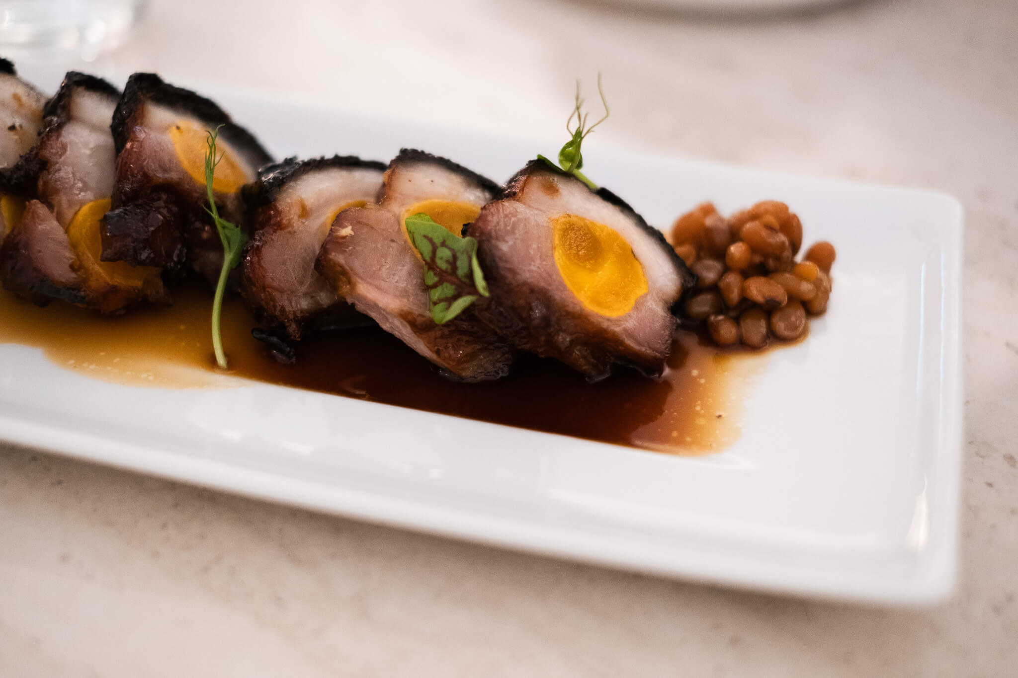 涼菜「黃金黑叉燒」尤屬翻玩經典菜色的代表,主廚 Denny 選用油脂更為豐潤的五花肉,取代傳統叉燒常見的梅花肉,並於肉心塞入鹹蛋黃,慢烤一小時後再以大火收乾,賦予焦糖化表皮的色澤與香氣。入口時焦糖香與蛋黃鹹甜交織,搭配蜜黃豆更顯風味。