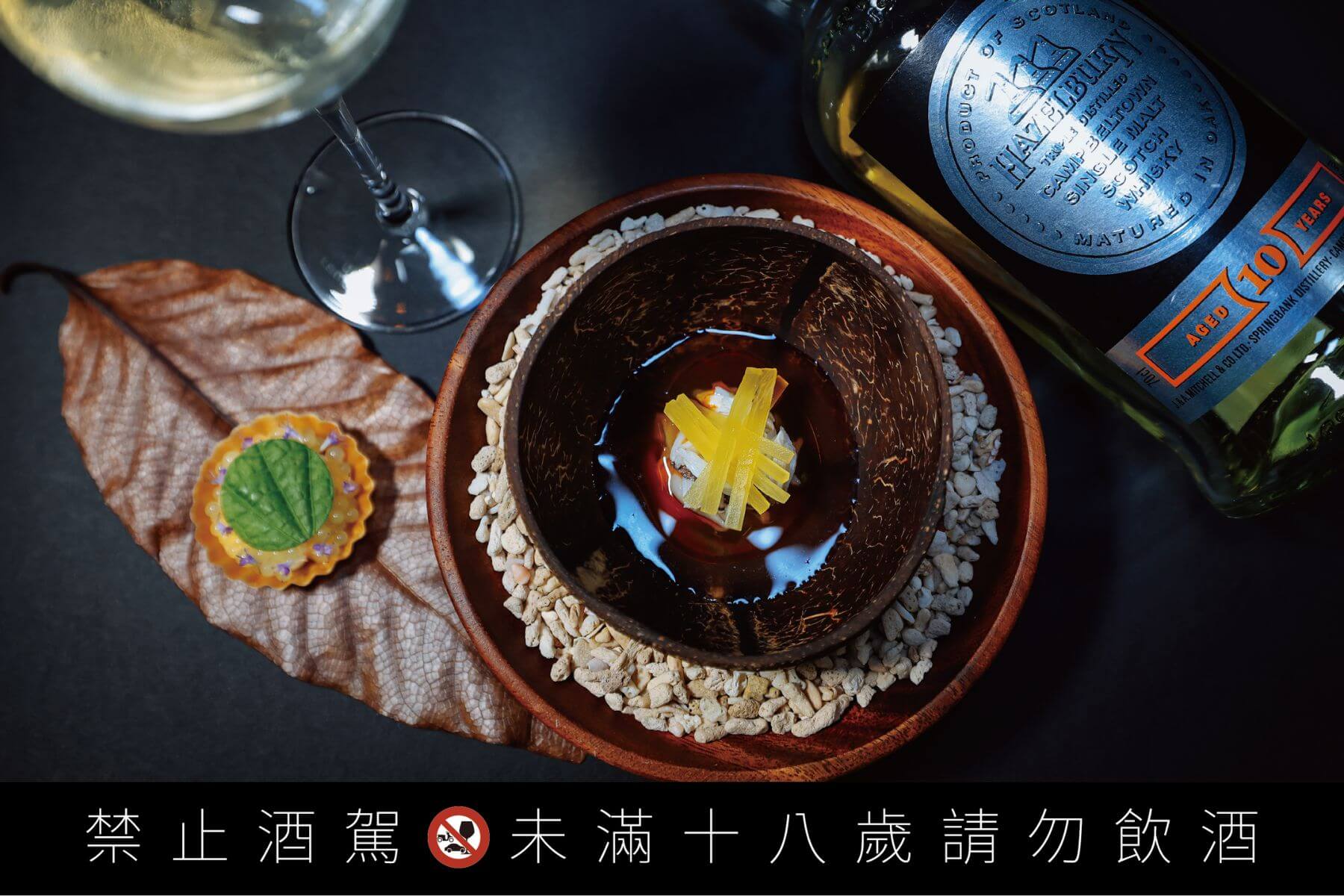 搭配酒款Hazelburn 10年,以三次蒸餾製成,酒體輕盈圓潤且充滿熱帶水果氣息的威士忌,與蘭嶼海岸的熱帶果實景象遙相呼應。