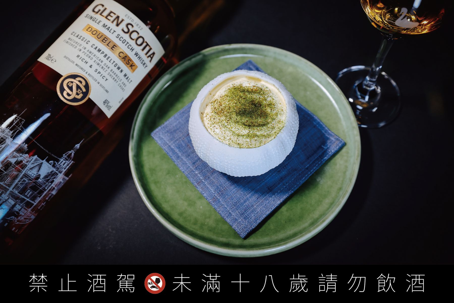 搭配酒款Glen Scotia Double Cask,Glen Scotia為坎培爾鎮留下的唯三酒廠之一,自1832年成立時便持續產出風味獨特的威士忌。雙桶熟成的平衡感來自初次裝填的波本桶以及香甜的Pedro Ximenez雪莉桶。由於甜味來自於海膽與南瓜,兩者口感皆偏濃郁厚重,侍酒師建議以純飲方式,感受威士忌的酒精感在口腔中被溫柔包覆。