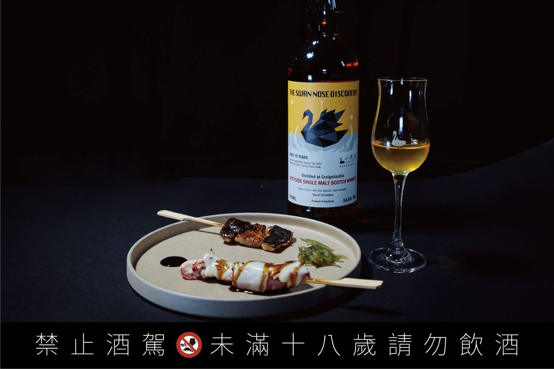 搭配酒款The Swan Nose Discovery-Hot Spring Cragellachie 2007 15年 ,作為小後苑新系列的第一支選桶,選擇被稱作Speyside叛逆壞小子的酒廠Cragellachie,因其特殊的製程造就了豐富的煙硝與火藥特質。三滴鹽水代表海洋,巧妙地連結了海鮮的滋味,與白子墨魚醬汁及海藻搭配,融合了輕微的硫磺氣息,強化了燒烤店的煙燻感受,彷彿身歷其境。