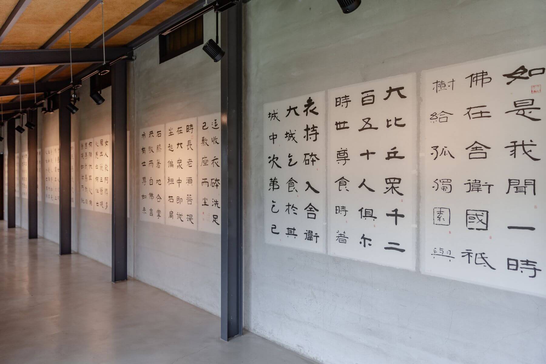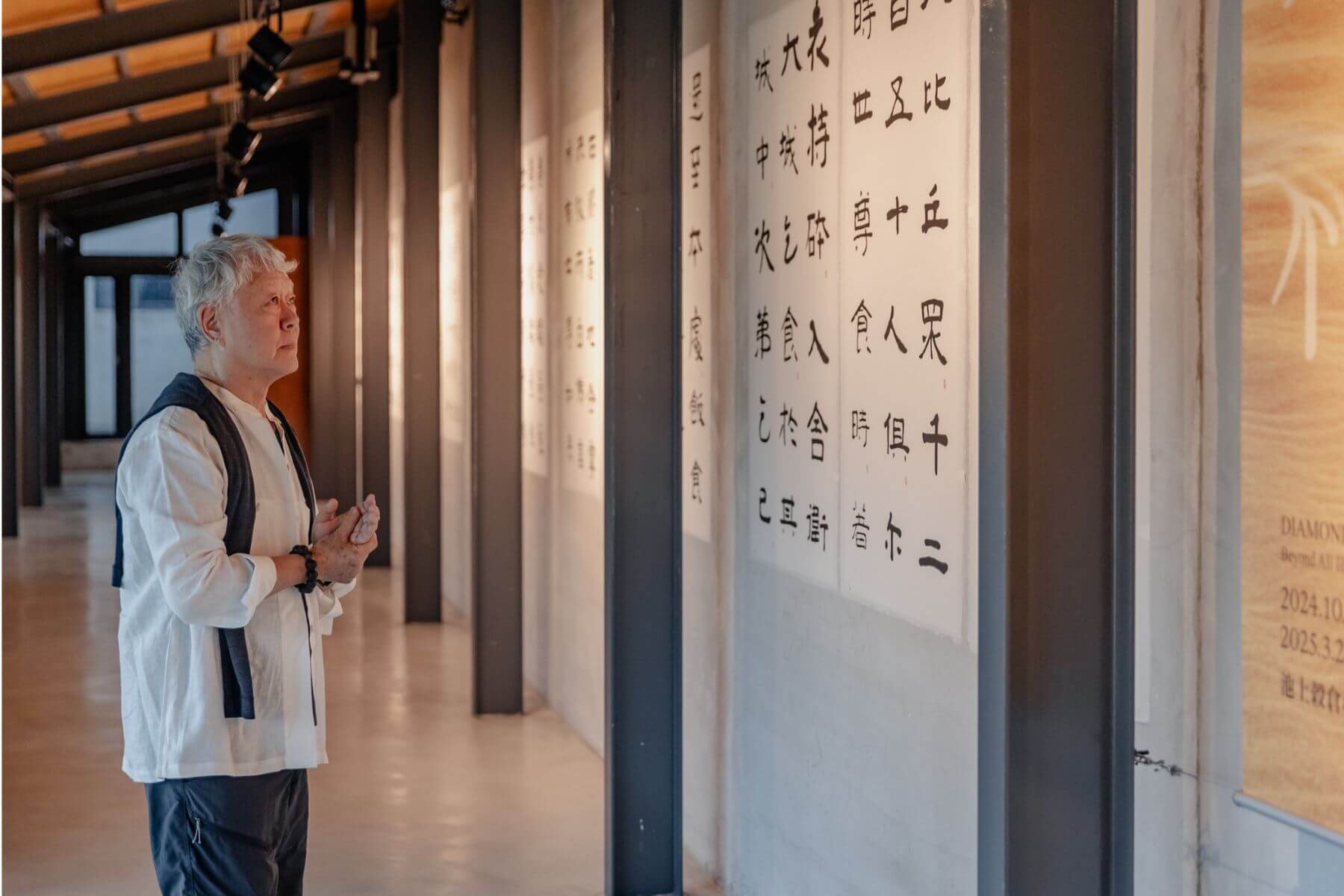 走進穀倉藝術館,長達十公尺的長廊,由蔣勳清晨恭敬手抄的十八連幅金剛經裱貼在牆上,領觀展者一步一步沉澱,走進金剛經的世界。仔細聆聽,空間裡則反覆播放著蔣勳親自朗誦《金剛經》的聲音,透過視覺和聽覺的五感沉浸,時空彷彿回到千年之前,信徒專注聽聞佛法的當下。