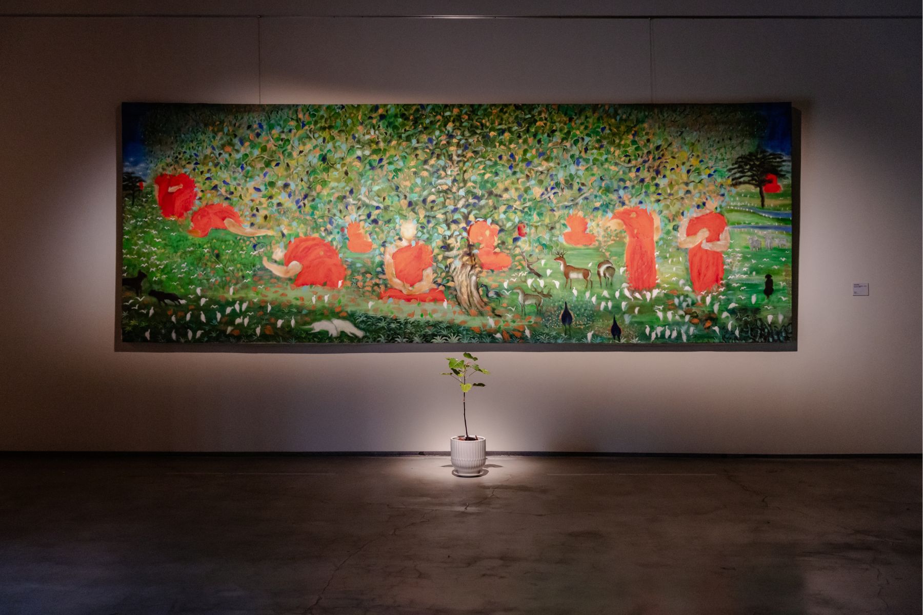 轉身踏進展場,首先映入眼簾的是蔣勳的大型油畫創作<袛樹給孤獨園>,想像兩千八百年前在森林裡靜坐修行的萬物眾生,體驗一花一世界及聲音光影的變化與時間的流轉。他覺得現在的池上就像當年的袛樹給孤獨園,很多人在這裡供養付出善意。