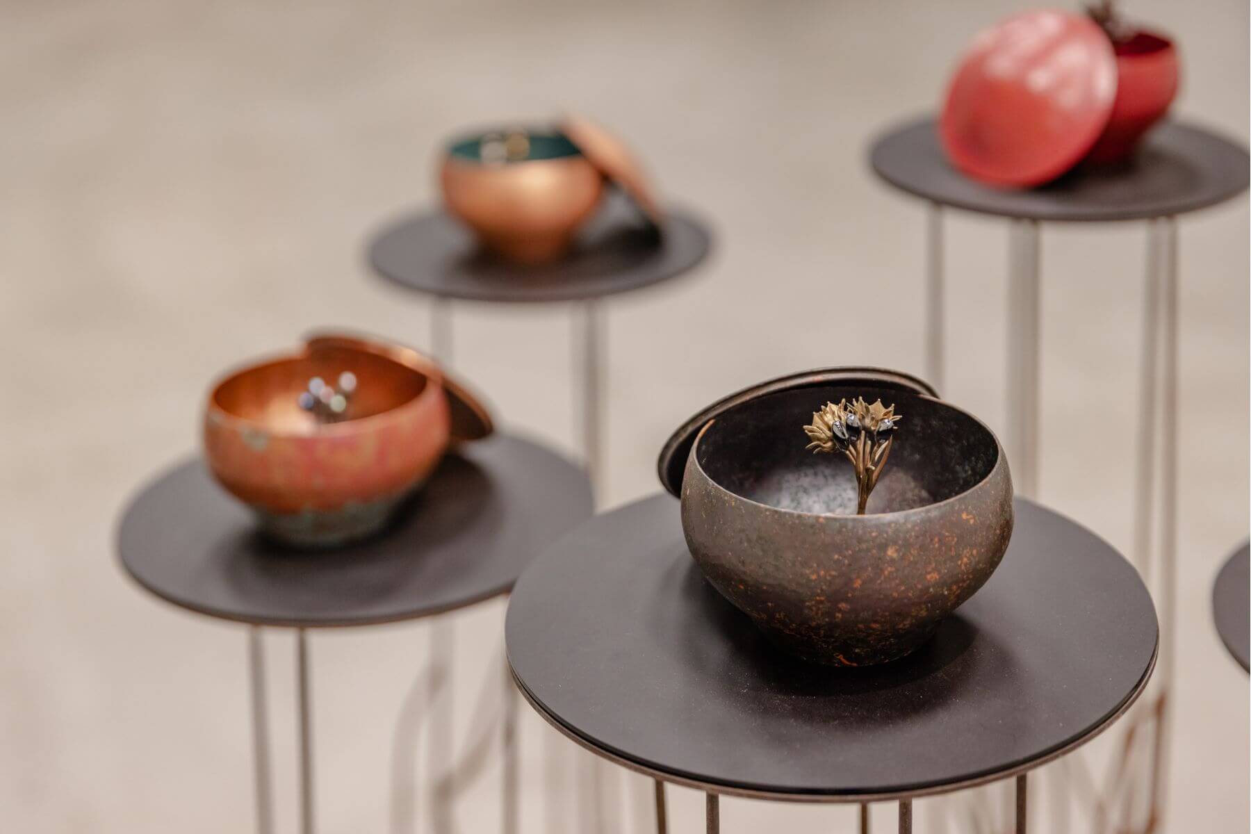 位於展場中央,曾永玲所創作的「蒔時一花一世界」金工系列,不同的鉢裡有顆心,就像是顆善念的種子,隨時間而成長茁壯,開花結果;「葉影系列」則以大坡池千變萬化的荷葉為靈感,在光影的變化中展現“諸相非相”的意義。