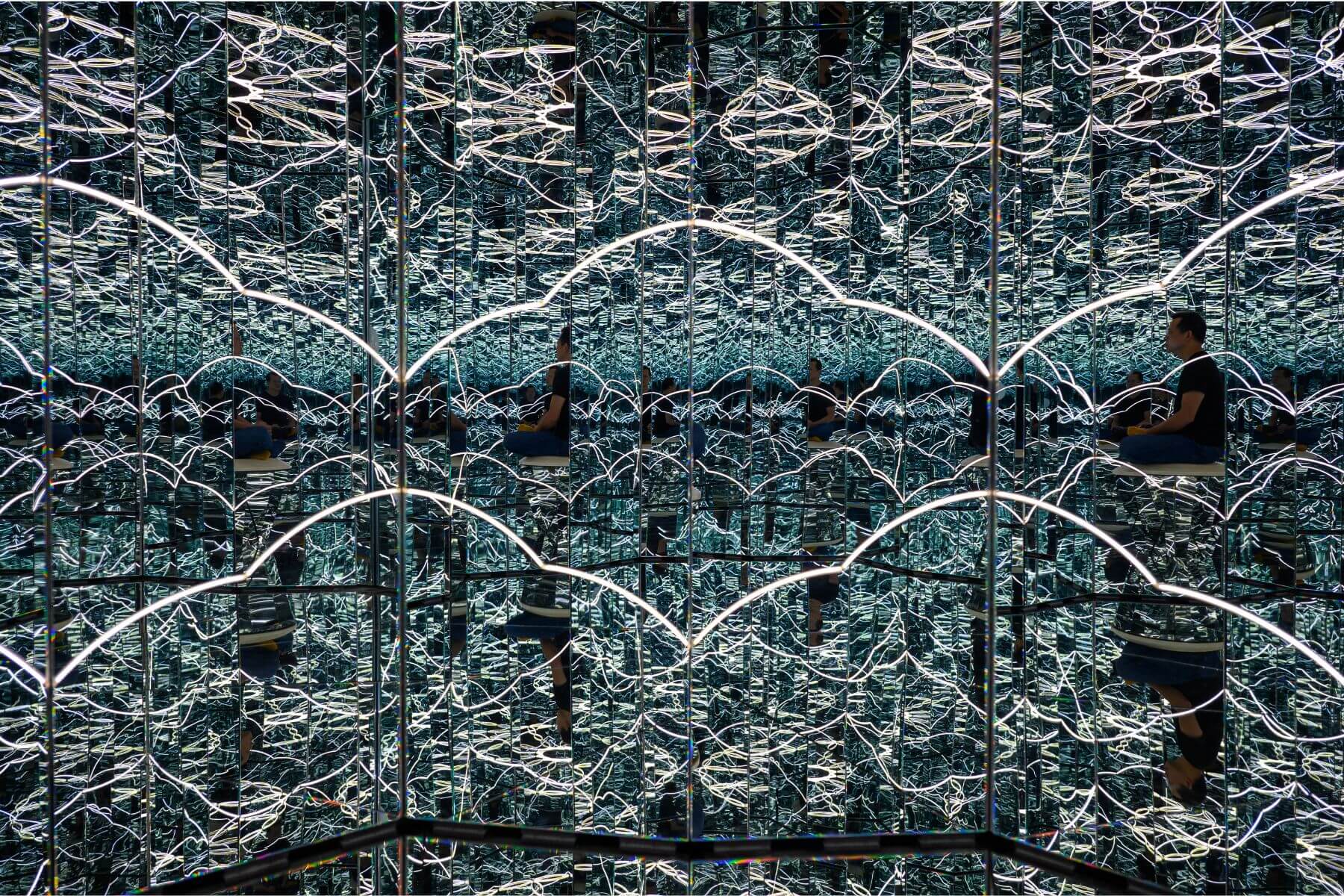 展場的另一端,由美國空運器材來台,董承濂的多媒體裝置作品「八十八吉祥之我執與無我的法輪」,則打造一個彷如萬花筒般,由無數鏡面包圍的空間,隨著從暗到亮及鏡面的開合變化,觀者置身其中,即可感受從有我到無我的境界。