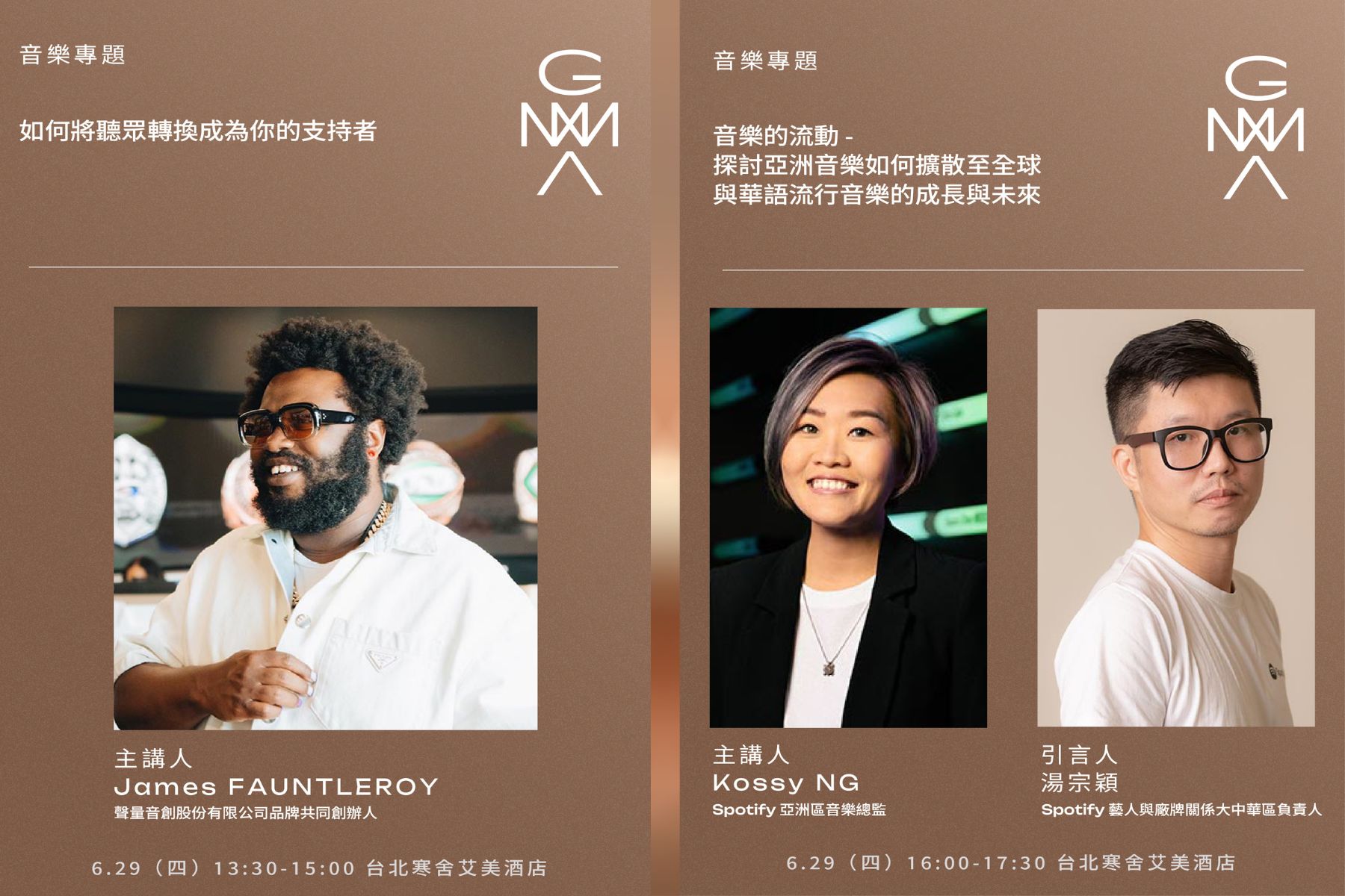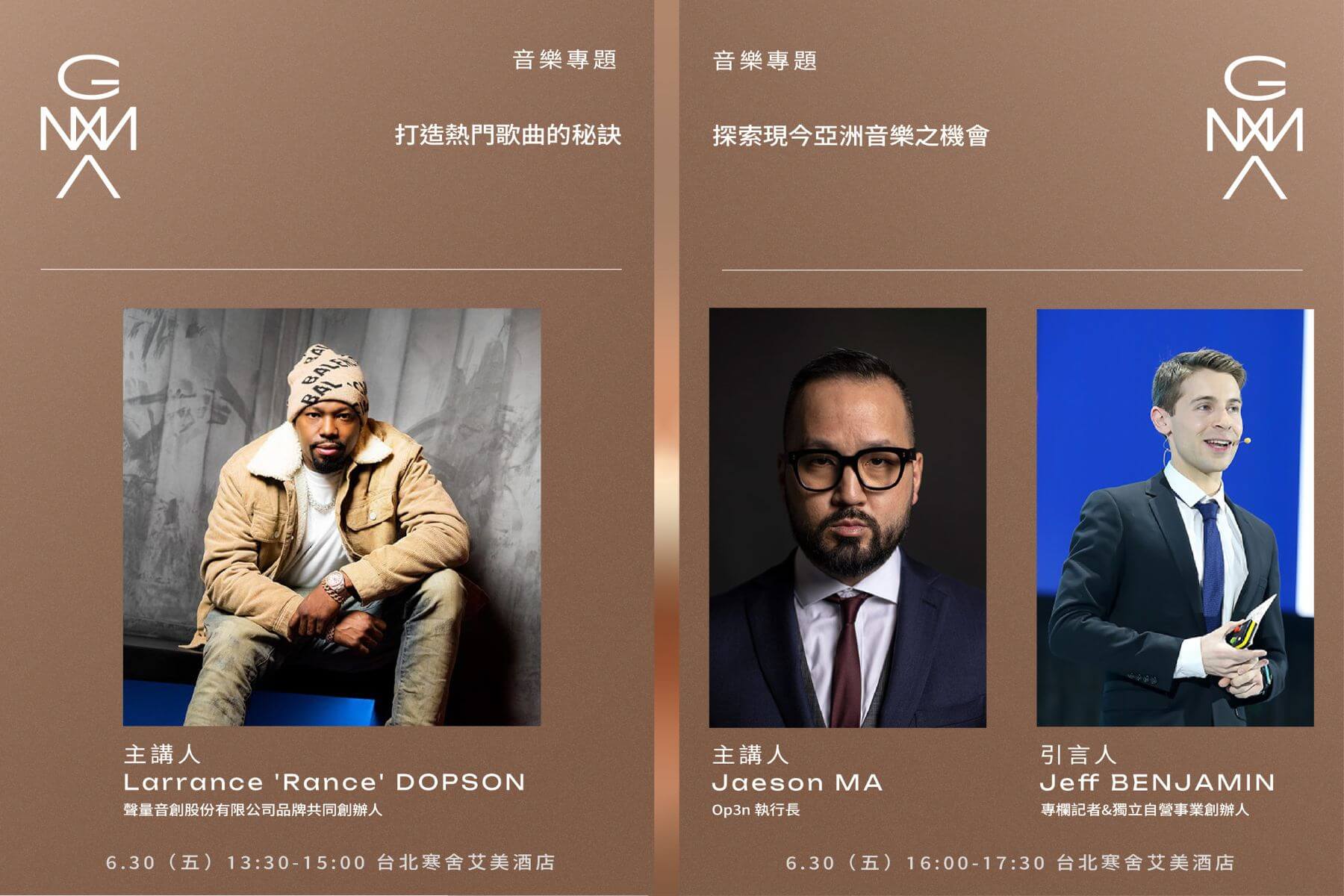 主辦單位邀請去年熱播影集《高校十八禁》的音樂總監Jen MALONE對談音樂監製角色在面對電視、電影及串流平台的策略;美國葛萊美常勝軍1500 Sound Academy兩位創辦人James FAUNTLEROY與Larrance 'Rance' DOPSON分享行銷和打造熱門歌曲的心得;國際音樂串流平台Spotify與創投家Jaeson MA,針對亞洲流行音樂的發展,提出第一手觀察。台灣指標性的演唱會製作公司源活娛樂負責人陳鎮川,將分享投入廿多年的演唱會製作心得。從6月28日至6月30日總計六場講座於台北寒舍艾美酒店,開放音樂節會員註冊報名參加。