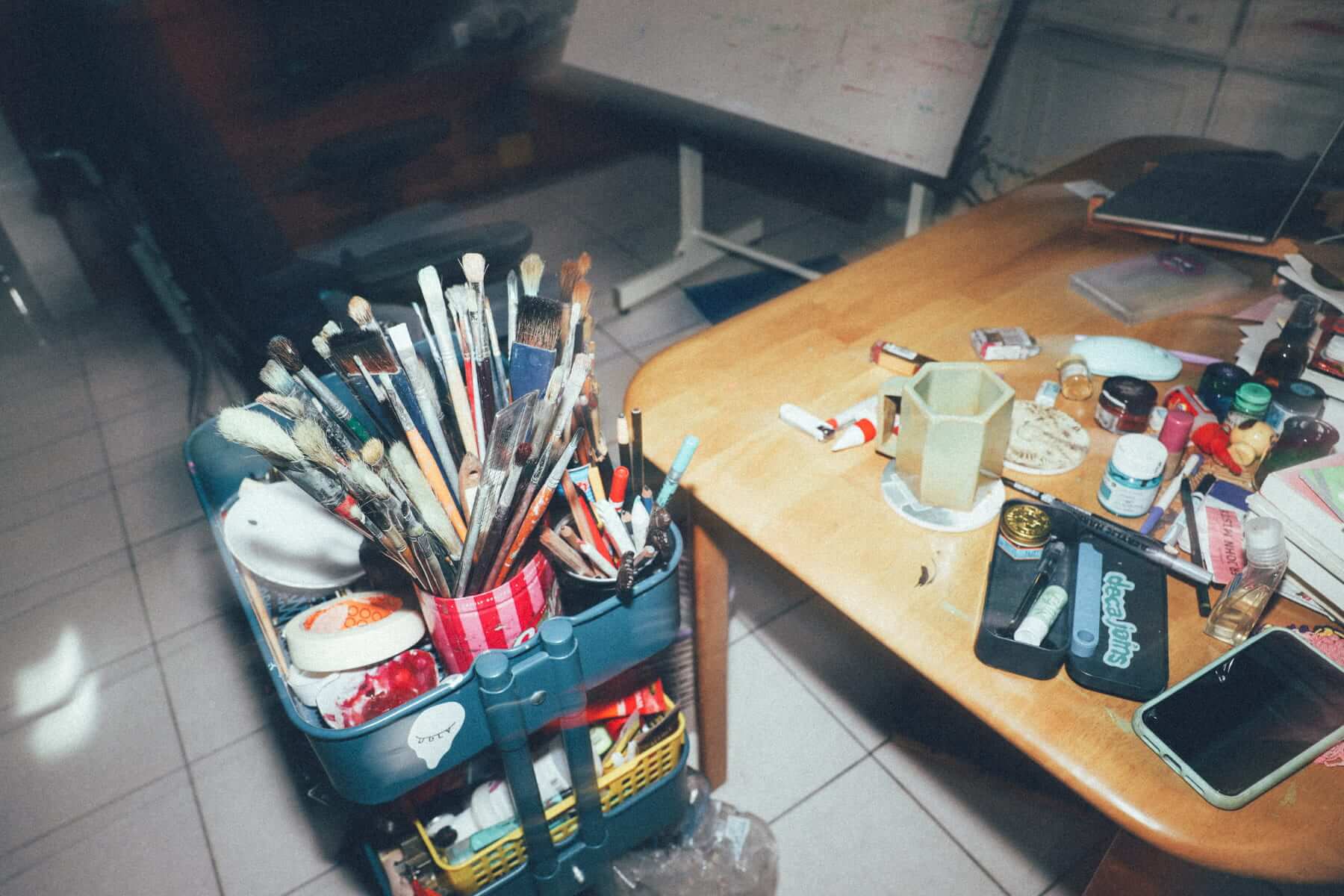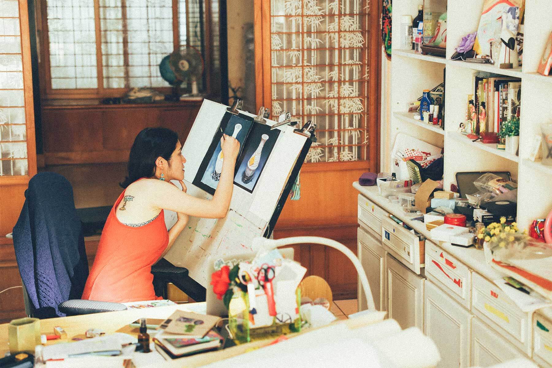 此外,她也想延續在英國開發的新手法,「我想繼續嘗試更多水墨筆法,看它可以變成什麼,也想挑戰油畫,所以才想把這裡變成一面可以掛畫的木板牆,應該需要一場大裝潢。」她指著目前還放滿怪寶貝的大櫃子,解釋決心斷捨離的原因: