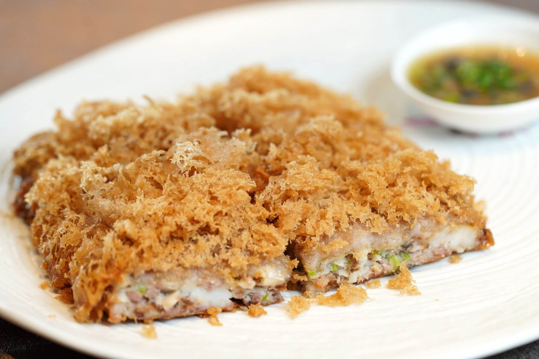 「荔蓉百花香酥鴨」也有創新亮點。傳統的香酥鴨是以片鴨搭配芋泥製成,但片鴨口感容易乾柴,因此簡師傅將烤鴨肉切絲,再與陳皮、馬蹄、蝦漿一同混合均勻,入蒸籠蒸熟後,再鋪上荔蓉,並以腐皮墊底,最後入油鍋油炸。層次豐富,更顯精緻美味。