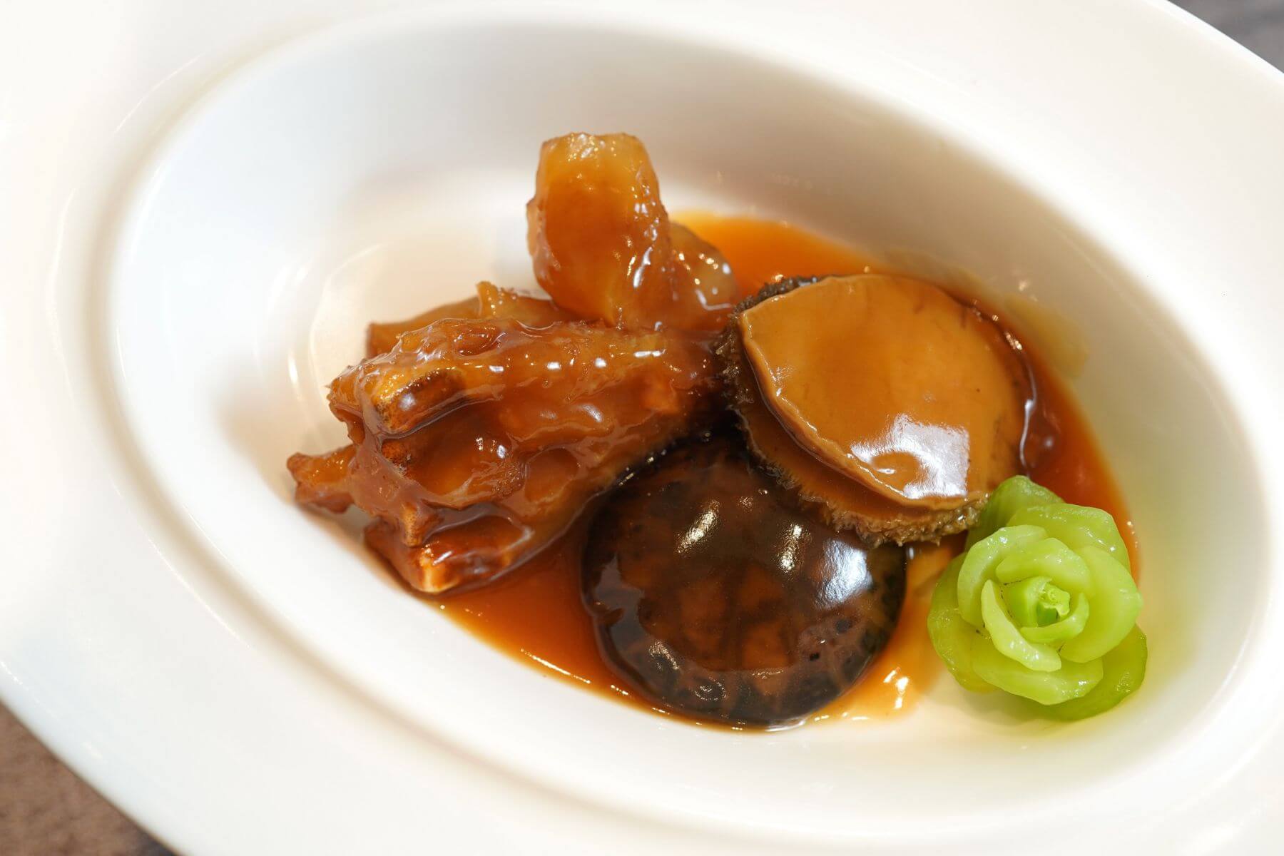 另一道「時蔬南北杏燉陳腎」也是佳品。陳腎性溫味甘,最適合在夏秋之際以燉湯溫補消燥。作法是將陳腎飛水後與南、北杏和菜膽一同煲製至少2.5小時,湯醇味濃郁,令人唇齒留香。