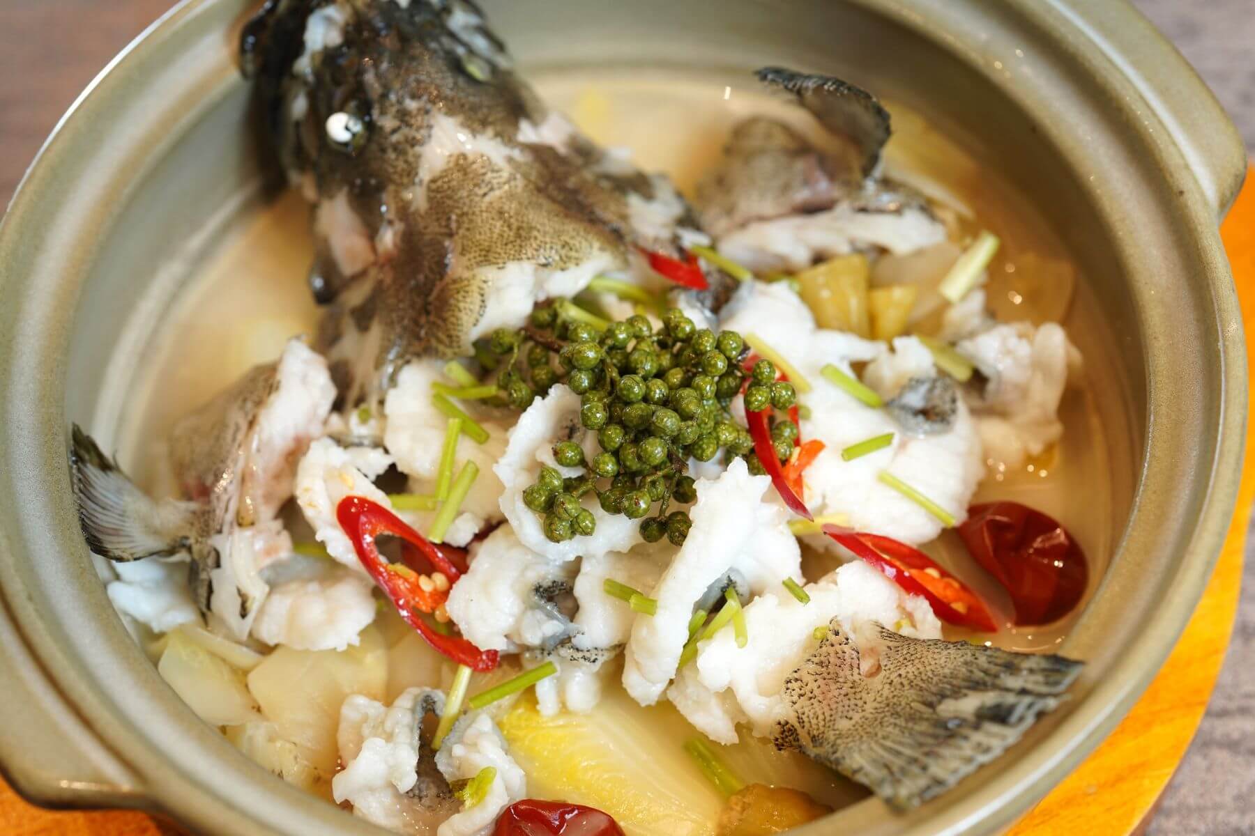 令人回味無窮的還有「泡椒酸菜水煮老虎斑」,主廚以普遍台灣人喜愛的溫潤辣度,並帶點酸的調味手法來演繹上等的肥美鮮嫩老虎斑。首先先將老虎斑去骨切片,魚骨的部份先熬製成高湯,過濾後加入俗稱「魚辣子」的泡椒、口感爽脆的酸菜芯以及老虎斑片,待湯頭沸騰且魚片熟成後即可上桌。辣而不燥的泡椒為口感鮮嫩細緻的老虎斑更添獨樹一格的酸麻風韻,讓人口水直流。