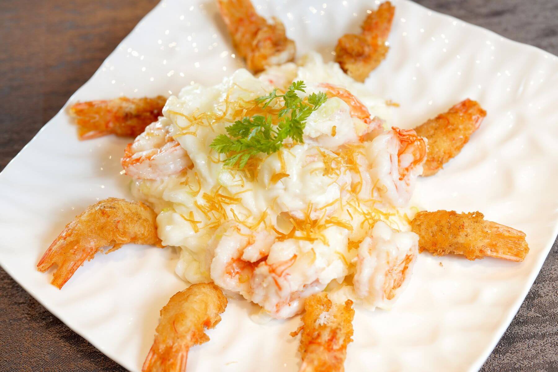 聚苑2.0可嚐到簡捷明的工夫菜色,例如「金絲鳳尾蝦」是一道極講究手工的粵式經典料理,也是廣東人每逢春節必做的美味年菜,富有腰纏萬貫的吉祥寓意。主廚選用明蝦,剝殼去除腸泥後打成蝦漿,用蝦泥包裹鳳尾蝦,接著外層再纏捲麵線,入油鍋以文火細炸,外酥內鮮,讓人愛不釋口。