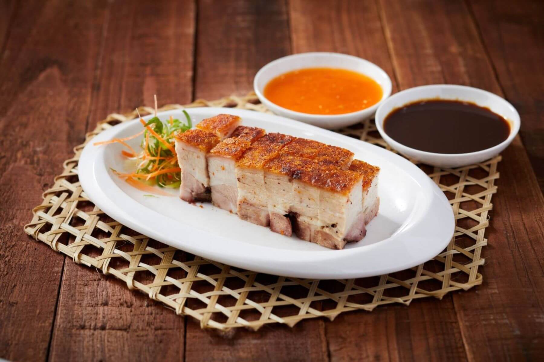 「燒肉」則是老闆池家瑋遠赴大馬,向有30年燒臘經驗的大廚拜師,將豬肉經過五香粉等醃製。豬皮抹油,經過四次轉換在爐桶方位,使其受熱均勻,豬皮蓬鬆酥脆、入口有聲,豬肉肥瘦相間,瘦肉香嫩、肥肉不膩。港澳的廣式脆皮燒豬配醬多搭黃芥末醬。馬來西亞脆皮燒豬佐海南辣醬、梅醬。海南辣醬由新鮮辣椒、薑、蒜、酸柑、醋等調味而成。冰梅醬由酸梅、冰糖熬煮而成,兩者皆有解膩之效。