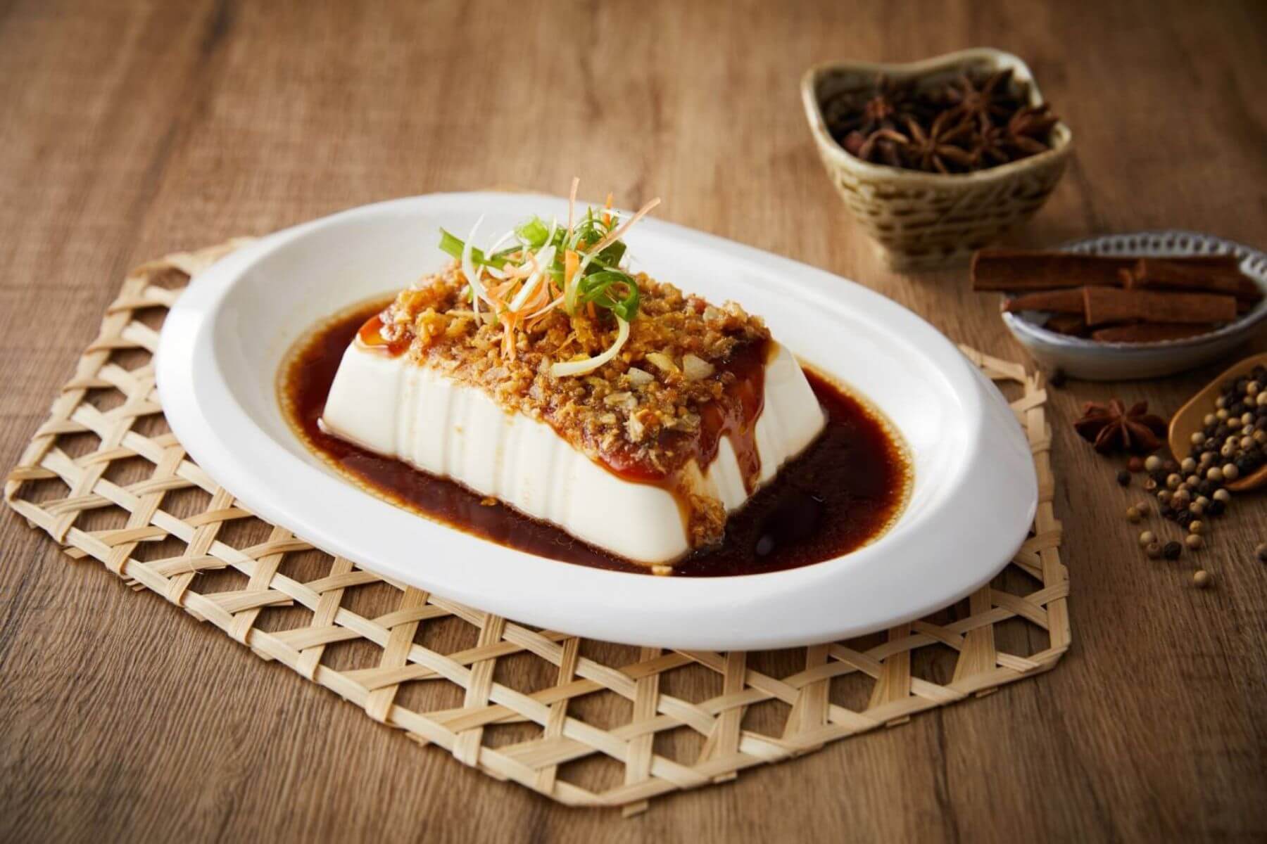 「蒸豆腐」把炒香的蝦米與蒜末,撒在蒸好豆腐上,淋上經過調製的馬來西亞美中美醬油,也很有家常味。