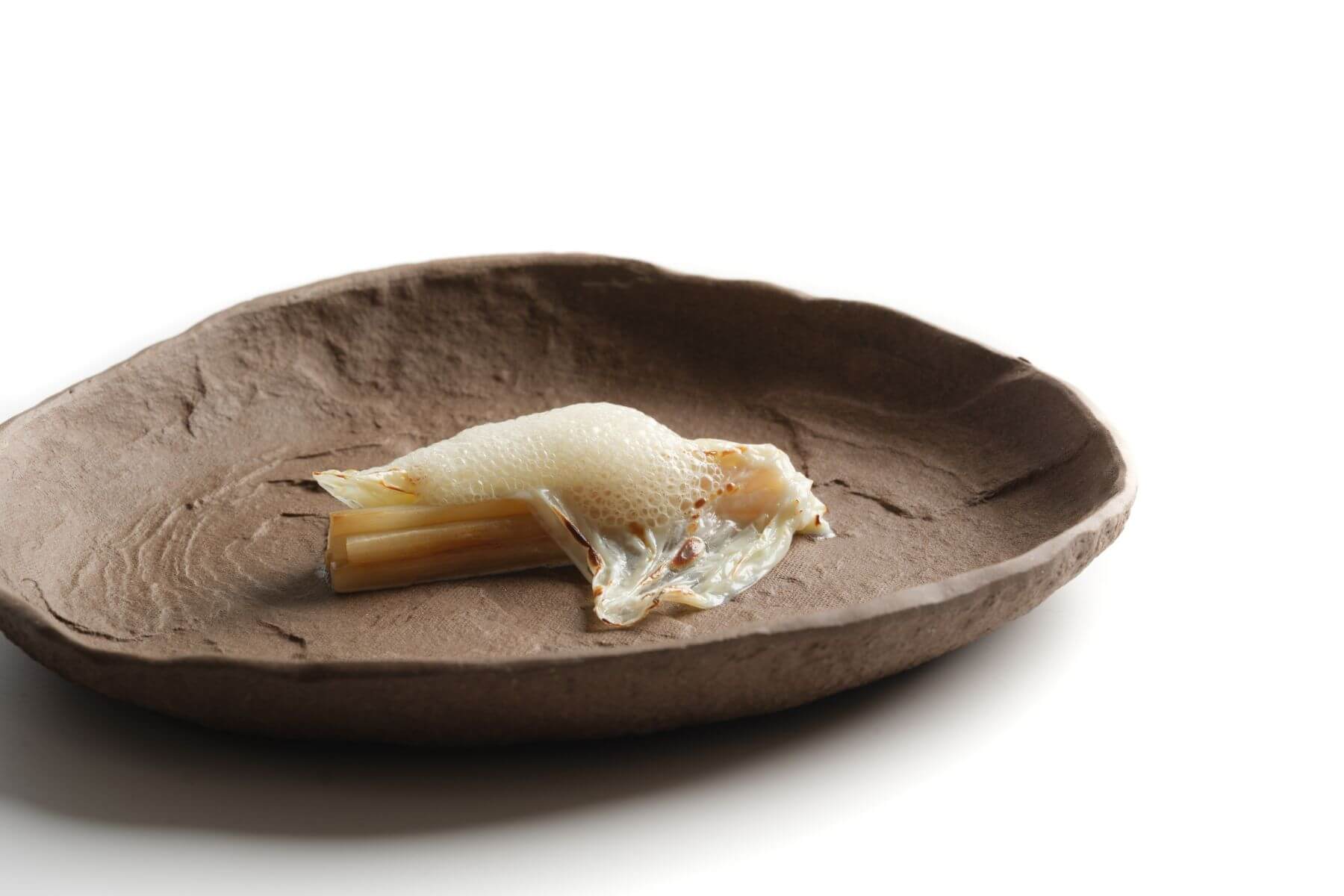 西班牙3月底至6月正是白蘆筍盛產的季節,趁著當季採收鮮嫩的白蘆筍,呈現著甜美收穫的滋味。白蘆筍取其最鮮嫩的部位刨成絲,以薑跟萊姆調味後嫩煎,口感鮮脆。白蘆筍發酵後會散發一股奶油香氣,主廚以此為靈感,於白蘆筍上方覆以一層牛奶皮(牛奶加熱後表層凝縮的薄膜),再將剩餘的蘆筍熬煮萃取的汁液打成泡沫覆蓋在上方搭配一起享用。