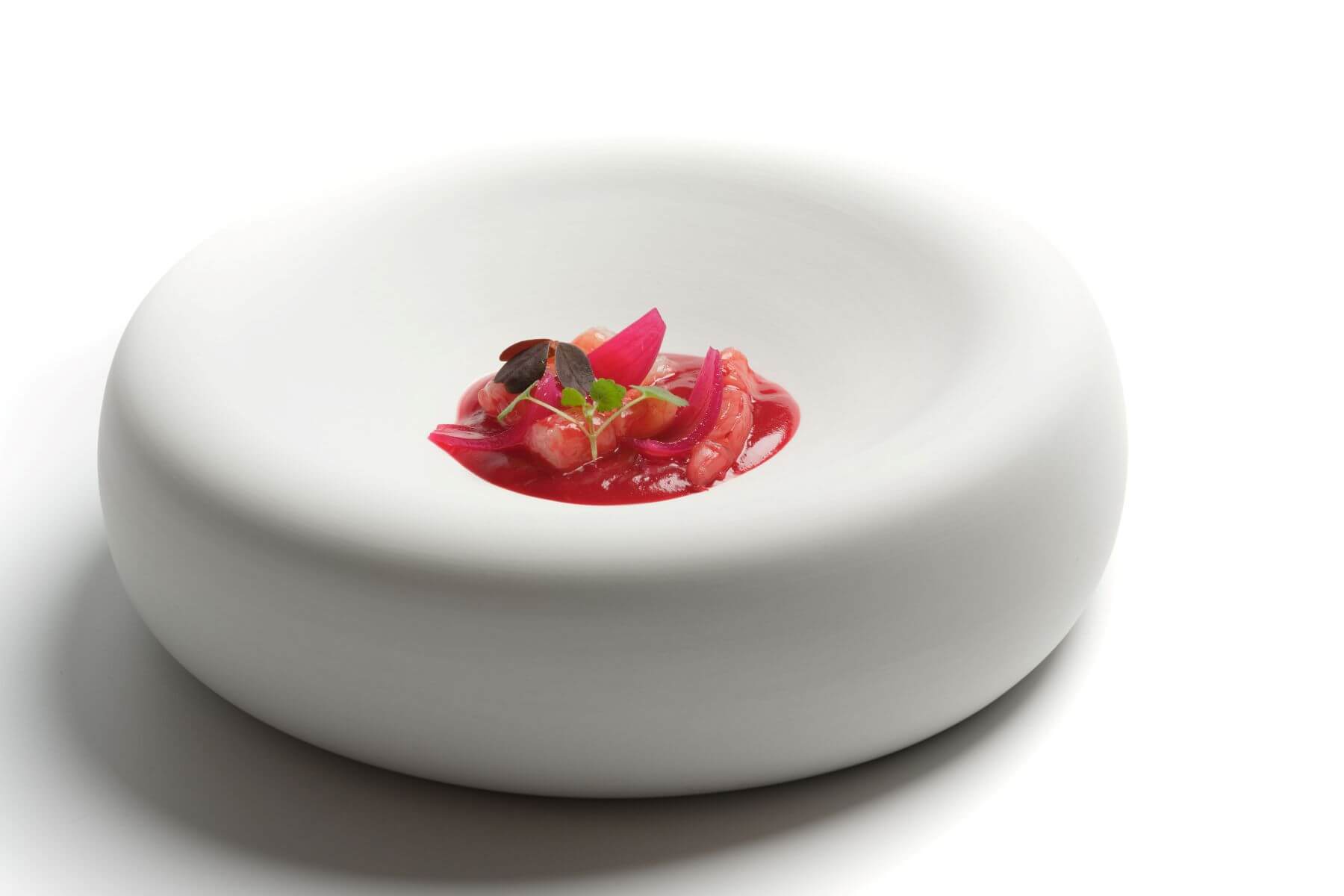 大海與陸地食材的完美結合,選用台灣在地胭脂蝦,以低溫蒸氣熟化1分鐘,呈現滑順鮮甜的口感,一旁搭配醋漬洋蔥,以及蝦頭與甜菜根製成的醬汁,三種不同層次的紅色,展現西班牙的熱情奔放,猶如佛朗明哥舞者跳舞時的迷人姿態。