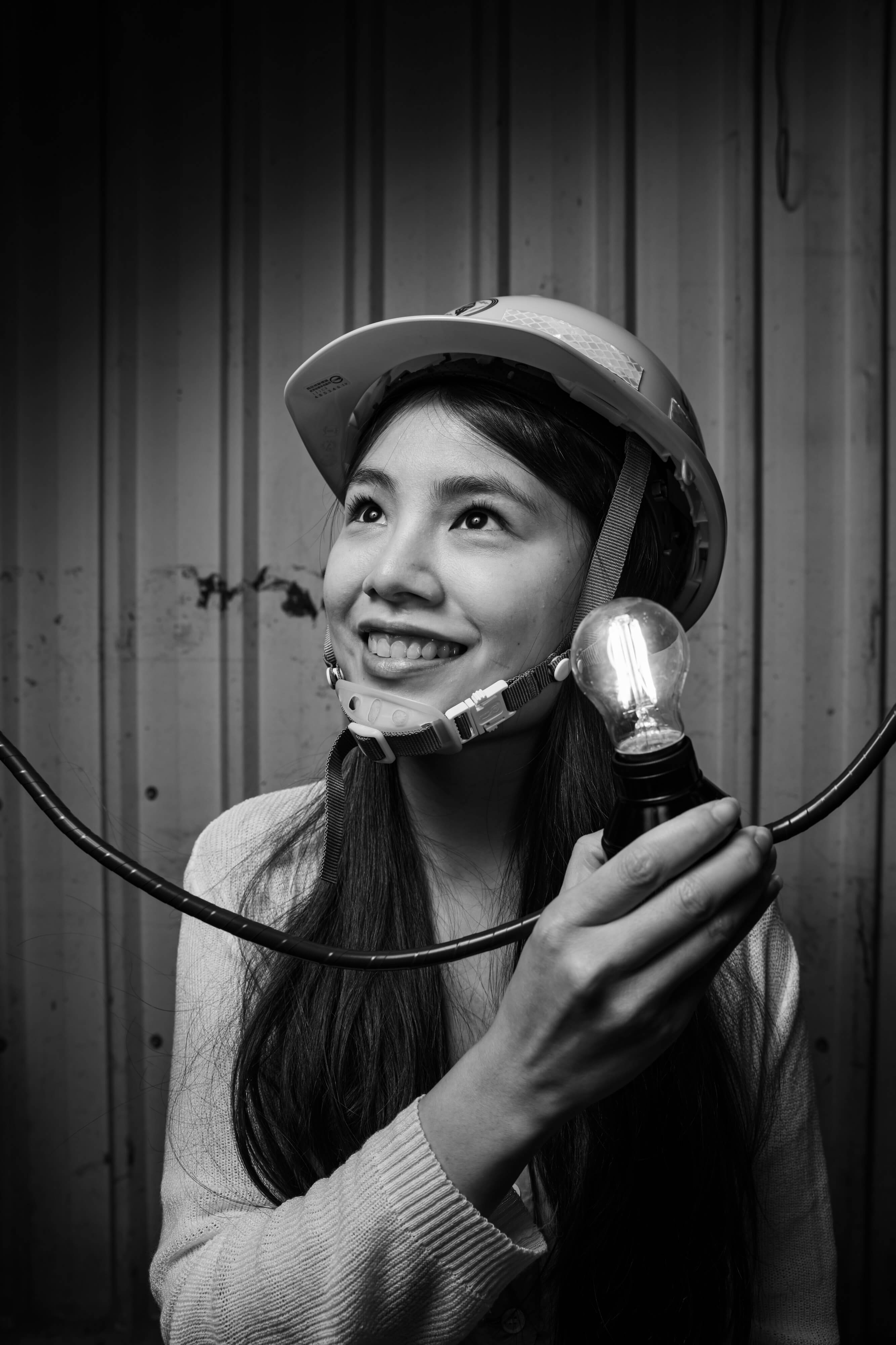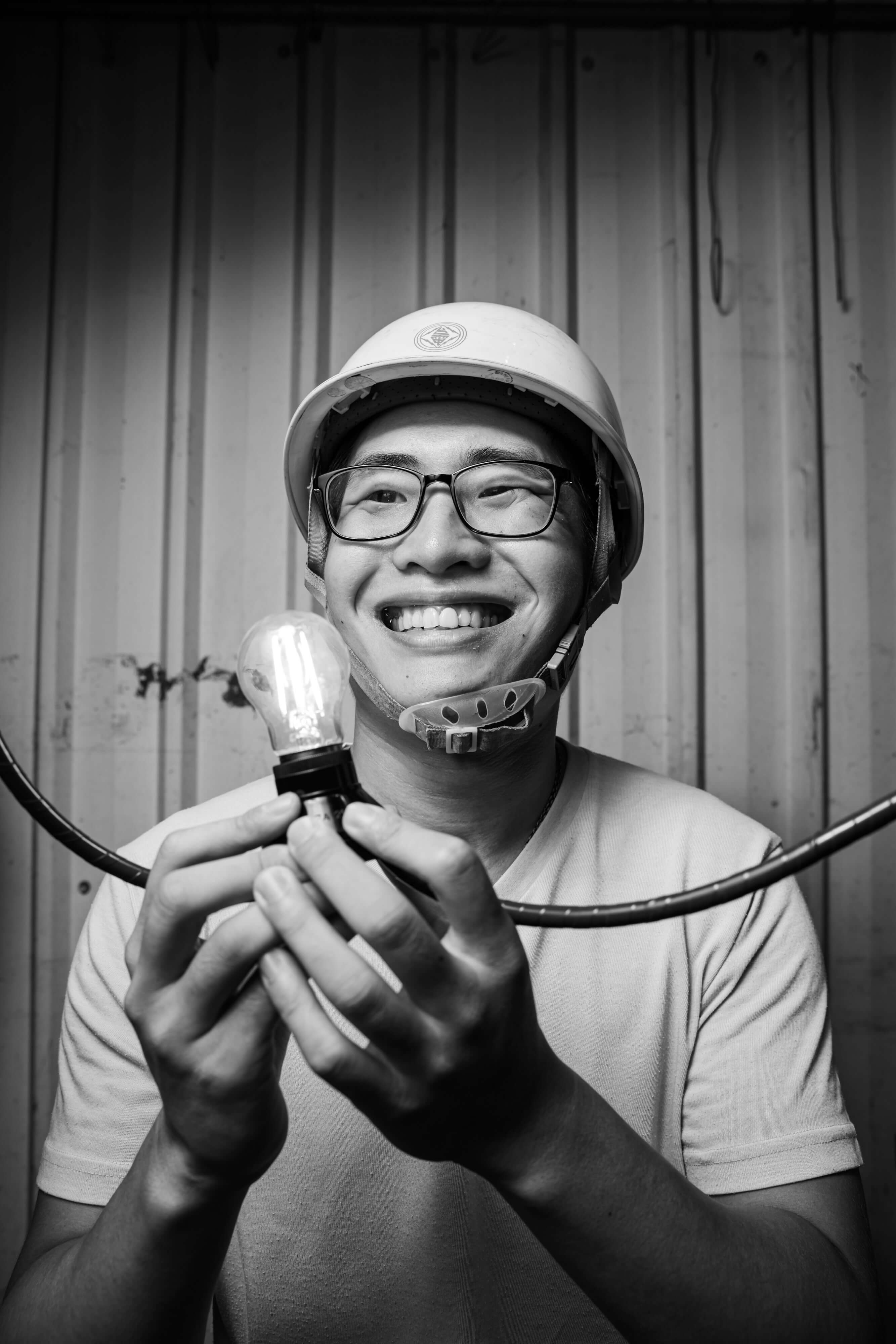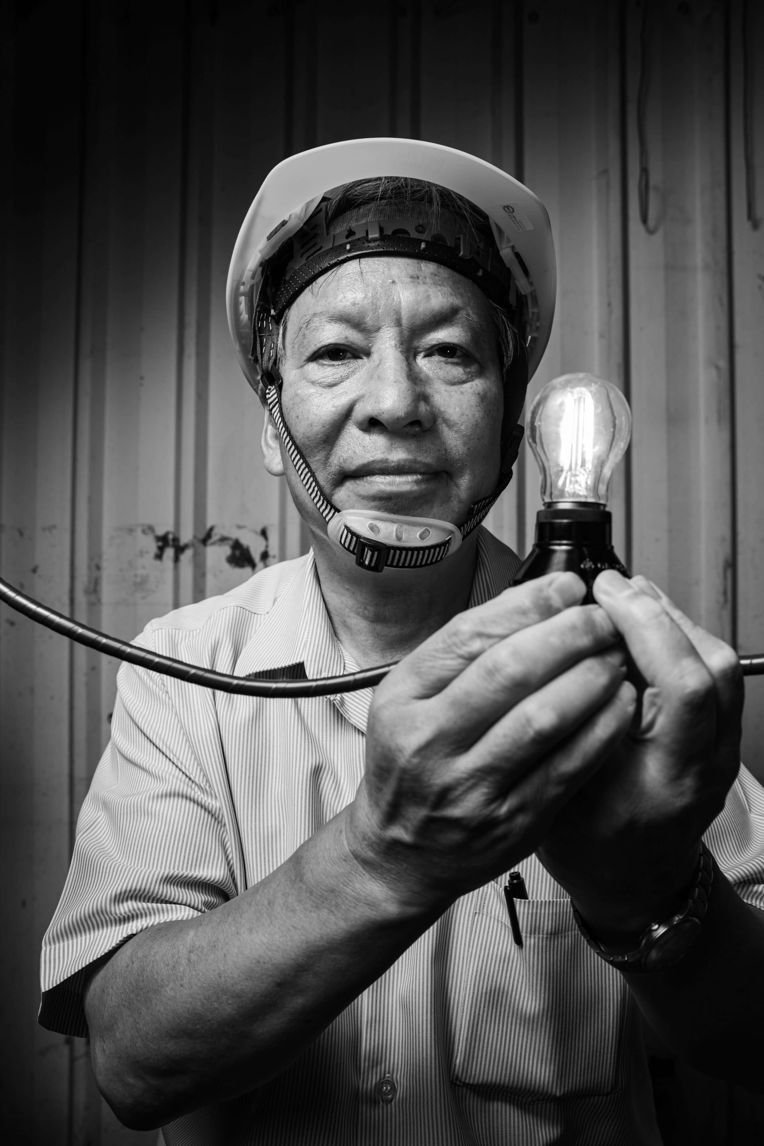 呼應 JR 的全球藝術行動需要一個明確的宣言,林昆穎和團隊從「南港通電,看見交界」出發,隨著台電修護處這個場域的出現與確認合作是非常巧妙的串連:通電後的光明,是需要集眾人之智慧與努力才以見得的光亮,那份便利與生活中的習以為常實則得來不易,團隊找了攝影師林科呈拍攝兩百多位台電修護處人員,個個手持燈泡,以相連的電線象徵那份綿延的能量,每一幅肖像照會是 100公分 x 100 公分大小,兩百多幅將一字排開張貼於台電修護處主廠房外牆,白晝之夜團隊透過藝術行動,向這群幕後英雄致上最高敬意!