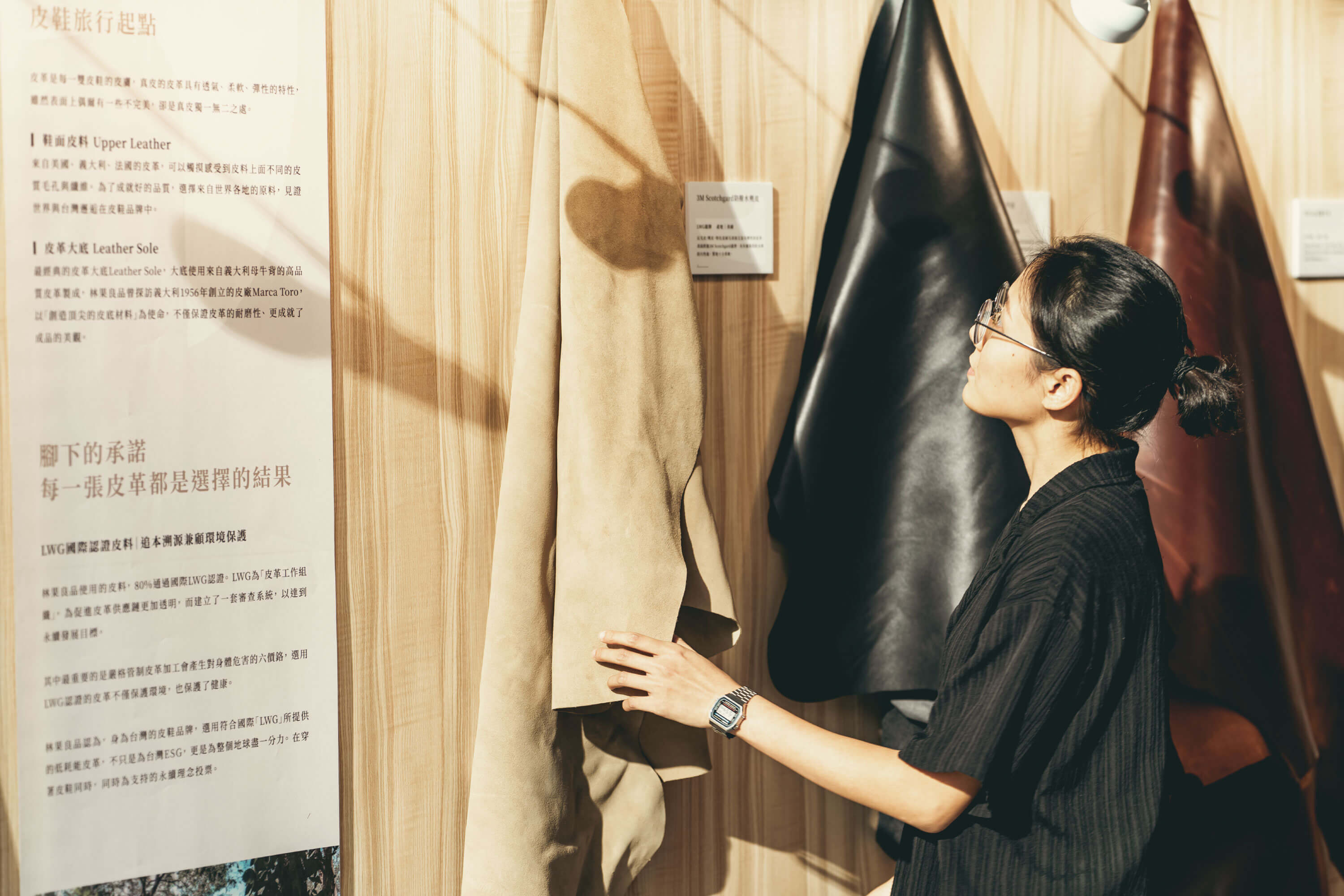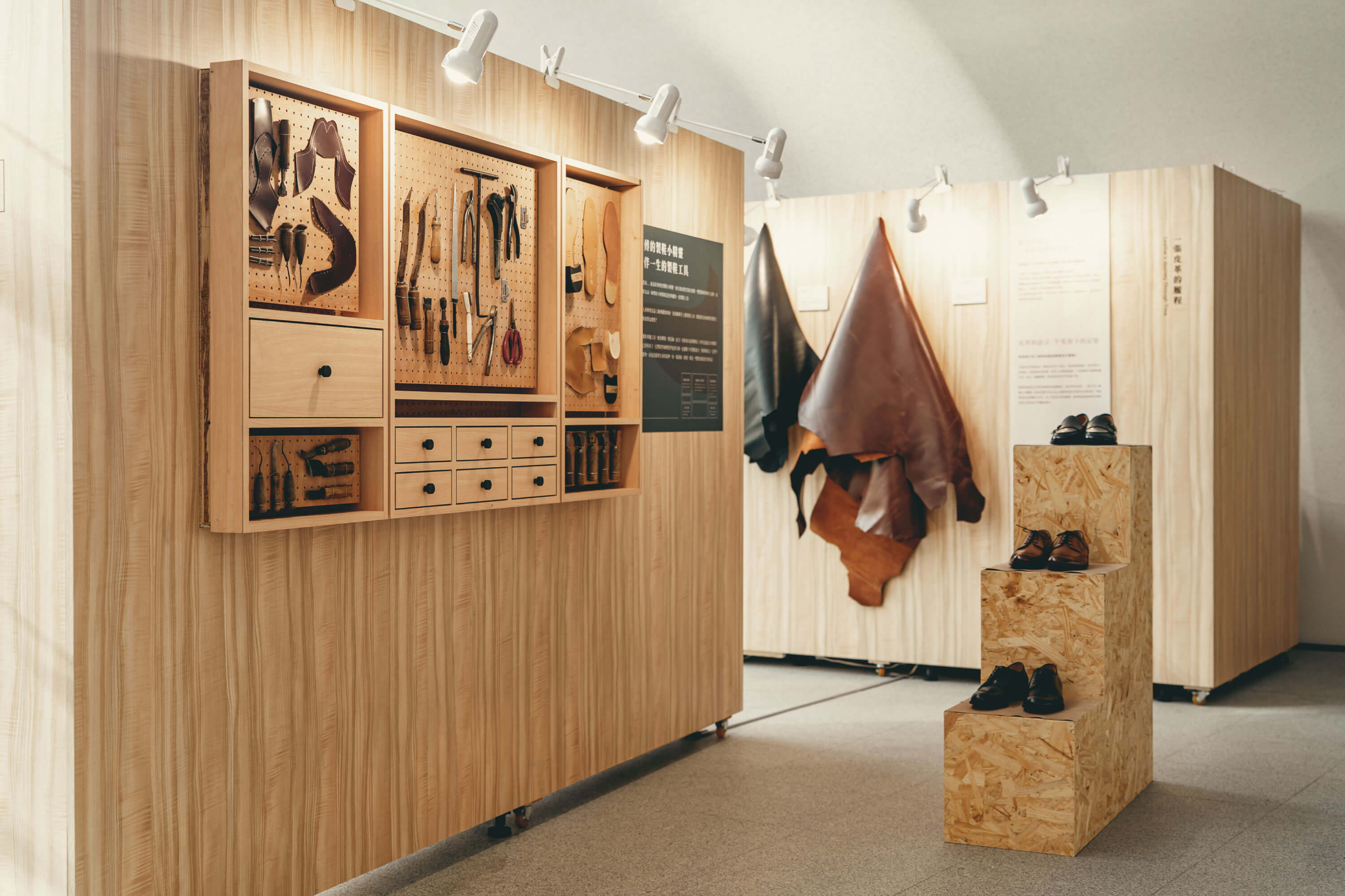 走進展區,迎面而來的是一間被時間停格的小屋。桌上整齊擺放著製鞋工具,皮箱靠在牆邊,鞋楦與皮革靜靜佇立,像是在等待下一場工序的開始。沒有師傅,也沒有喧囂,只有那些被長年使用過的器物,靜靜述說它們曾經被握在手心裡的歲月。在展區的另一側,皮革攤開成一道柔軟的風景,紋理、色澤與厚度的細微差異,都在光線下清晰可見。林果良品使用的皮料,有 80% 來自國際 LWG 認證的環境友善皮革——每一張皮革,不只是製鞋的原料,也是一個關於永續與選擇的故事。而那些工具,對師傅來說從來不只是物件,而是技藝的延伸,是時間磨出來的精準與柔韌。