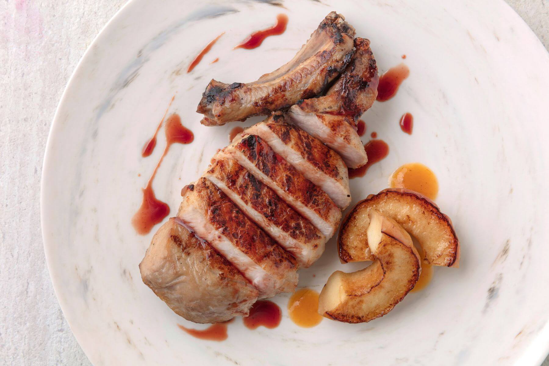 主餐「YAKI 台灣究好豬排」採用來自台灣的頂級究好豬,選用帶骨里肌部位,先以直火煎烤;搭配以奶油糖烤過,再以乾煎誘發香氣的蘋果;最後淋上以豬骨、白蘭地與奧勒岡州蔓越莓濃縮汁熬煮的酸甜醬,在濃甜蘋果及莓果香氣襯托之下,豬排的脂香升級地更加迷人,酸甜的份際顯得相得益彰。