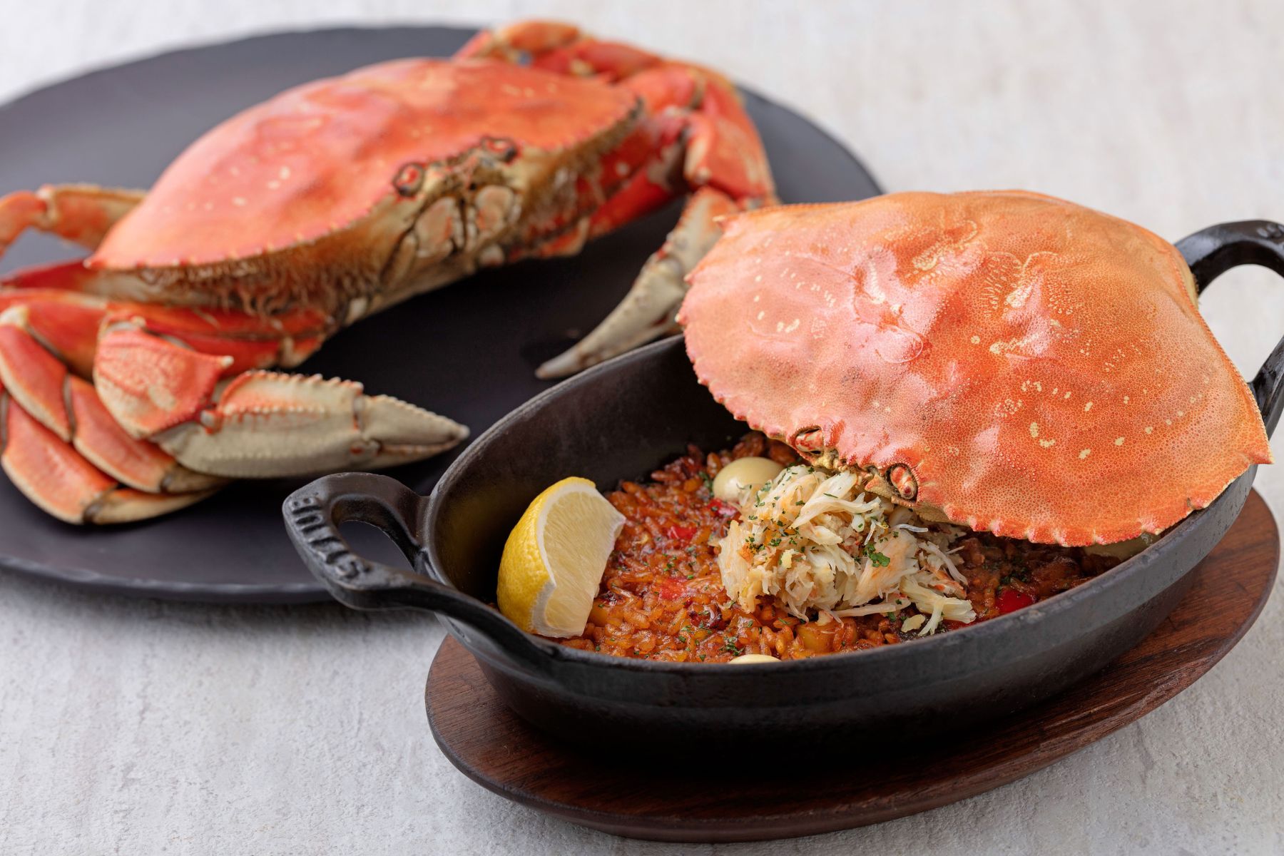 另一款「西班牙海鮮烤飯」,主廚以雞骨、鮮蝦、蛤蜊悉心熬製鮮味十足的高湯,加入炒香過後的西班牙米BOMBA、番紅花、番茄及甜椒,經由大火熬煮,讓米粒吸飽湯汁後仍堅實飽滿,口感軟中帶硬。搭配來自奧勒岡州、肉質細嫩、味道鮮美的珍寶蟹肉絲,以及主廚特製蒜味美乃滋,鮮味層次分明,令人吮指。