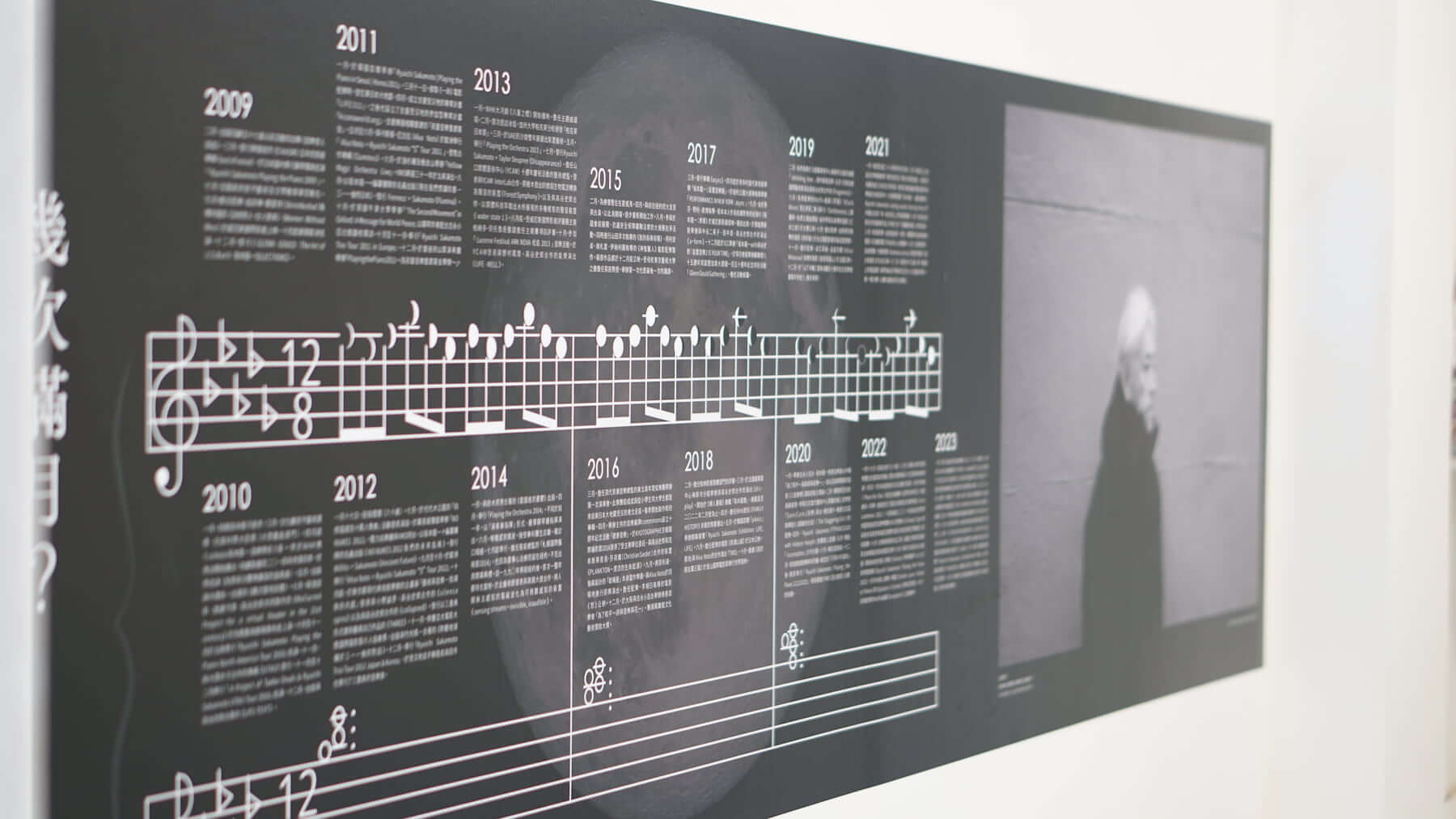 坂本龍一在《我還能再看到幾次滿月?》中,回顧近十餘年的人生經歷,並記錄了生命中最後的點滴,因此在特陳展中,特別將書末的生平年表以視覺化呈現,搭配化為月亮的音符,隨著〈Merry Christmas Mr. Lawrence〉樂譜展開,陳列出坂本龍一生前親自挑選的葬禮曲目,讓讀者能夠感受音樂大師「堅持創作到生命最後一刻」的精神。