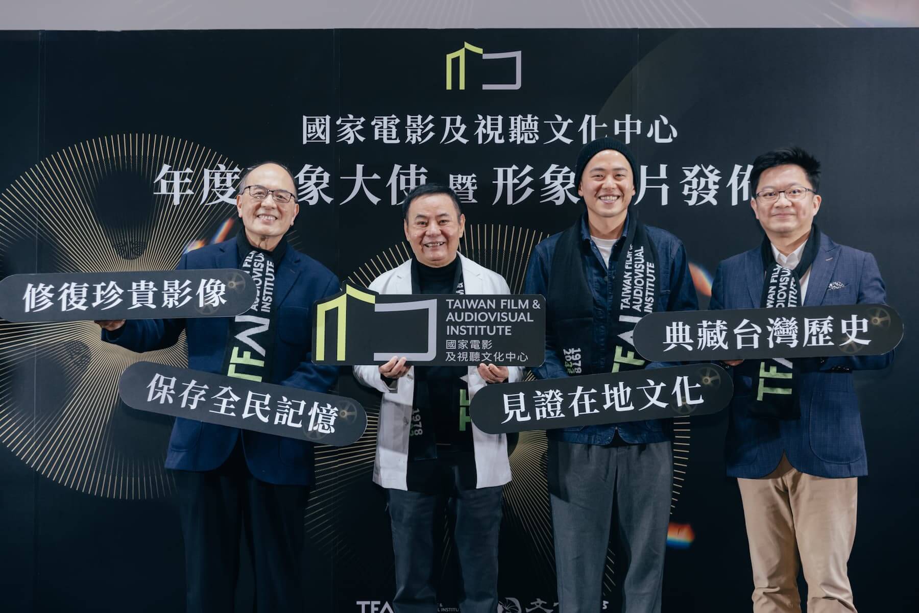 國家影視聽中心公佈年度形象大使為三金資深藝人蔡振南(圖左二),並邀請新銳導演許智彥(圖右二)編導形象影片。國家影視聽中心董事長藍祖蔚(圖左一)、執行長李智仁(圖左一)也一同見證歷史性的一刻。