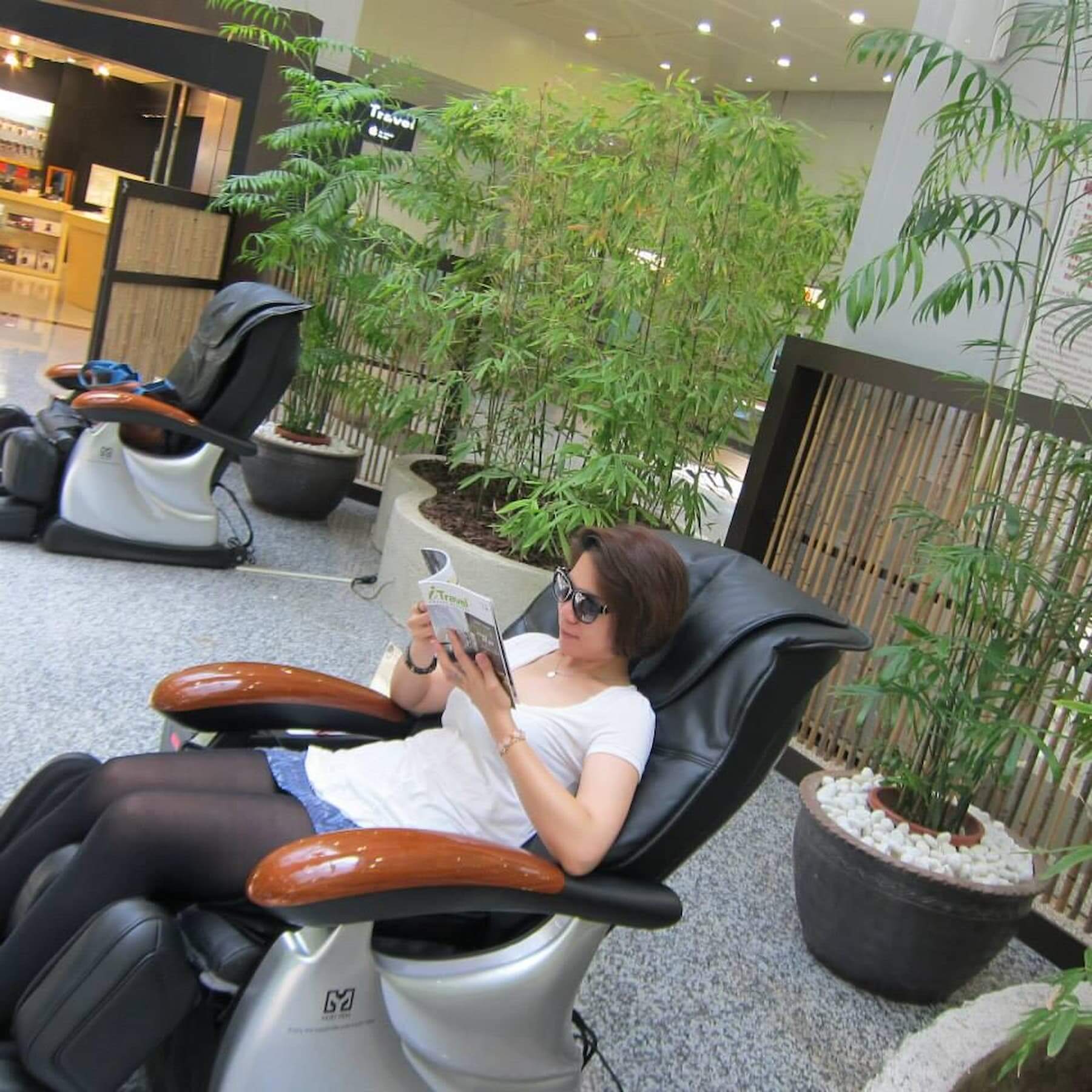 隱身在第二航廈有一處被竹林所環繞的全身按摩椅區,頭肩頸到腰部都顧到了,一列下來約10台按摩椅,只要到免稅店詢問索取按摩椅代幣,就可以獲得一次15分鐘的免費按摩體驗!
