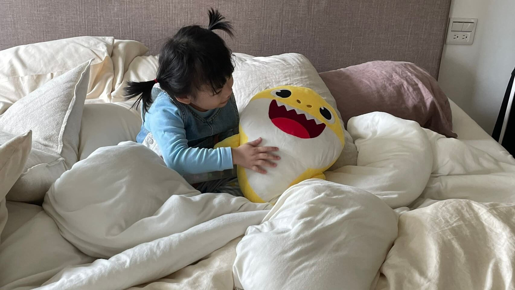 入睡前,她會墊腳瀏覽書櫃,選定喜愛顏色封面書籍一本,一邊大喊顏色英文名,接著翻頁閱讀仰躺喝奶。奶量先以90c.c.為佳,十分鐘讀畢。再選媽媽手中讀物,哭鬧交換,奶量再以90c.c.,十分鐘讀畢。最後選定陪睡好友,黃色鯊魚一隻,最後90c.c.,立即昏倒沉睡。