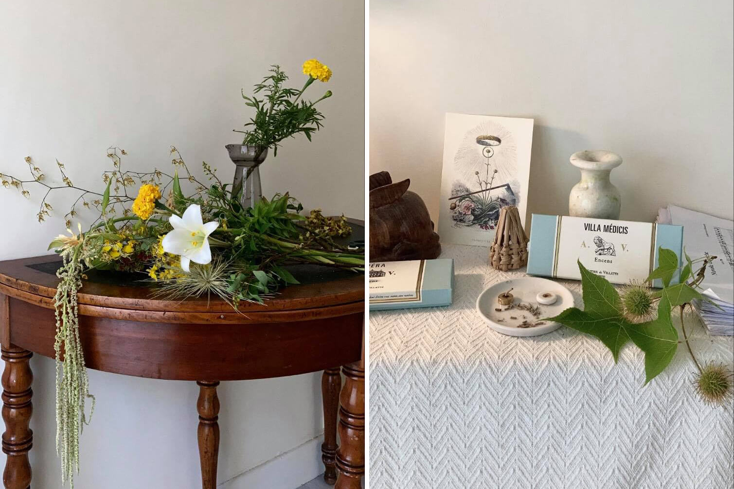 接著把自己打理好,在家中也會習慣噴上香水讓心情保持愉悅。撕完日曆後,會幫花瓶裡的花重新剪莖換水,有時家中花很多,得花上一段時間,所以會配上輕柔的背景音樂和線香,這個過程很像晨間冥想,讓身體慢慢甦醒,也讓不安的心隨著整理花平靜下來。