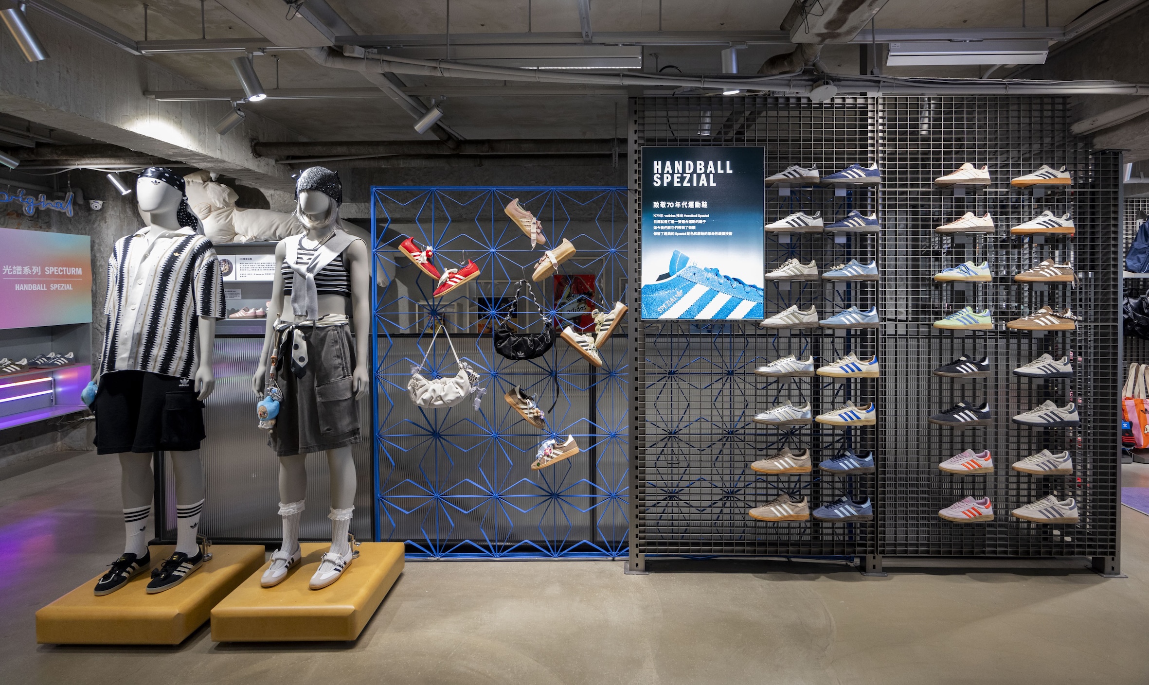 另一面鞋牆,展示全系列「彩色光譜」Handball Spezial,以微型藝術展概念打造,燈光呼應夏日到秋冬的色彩變換,除了夏日推出的5色鞋款,也搶先展示出即將陸續上市的7色秋冬色系。從清新自然到熱烈奔放、從低調內斂到大膽前衛,更是對這款經典鞋型多元進化歷程的致敬,持續定義當代街頭風尚。