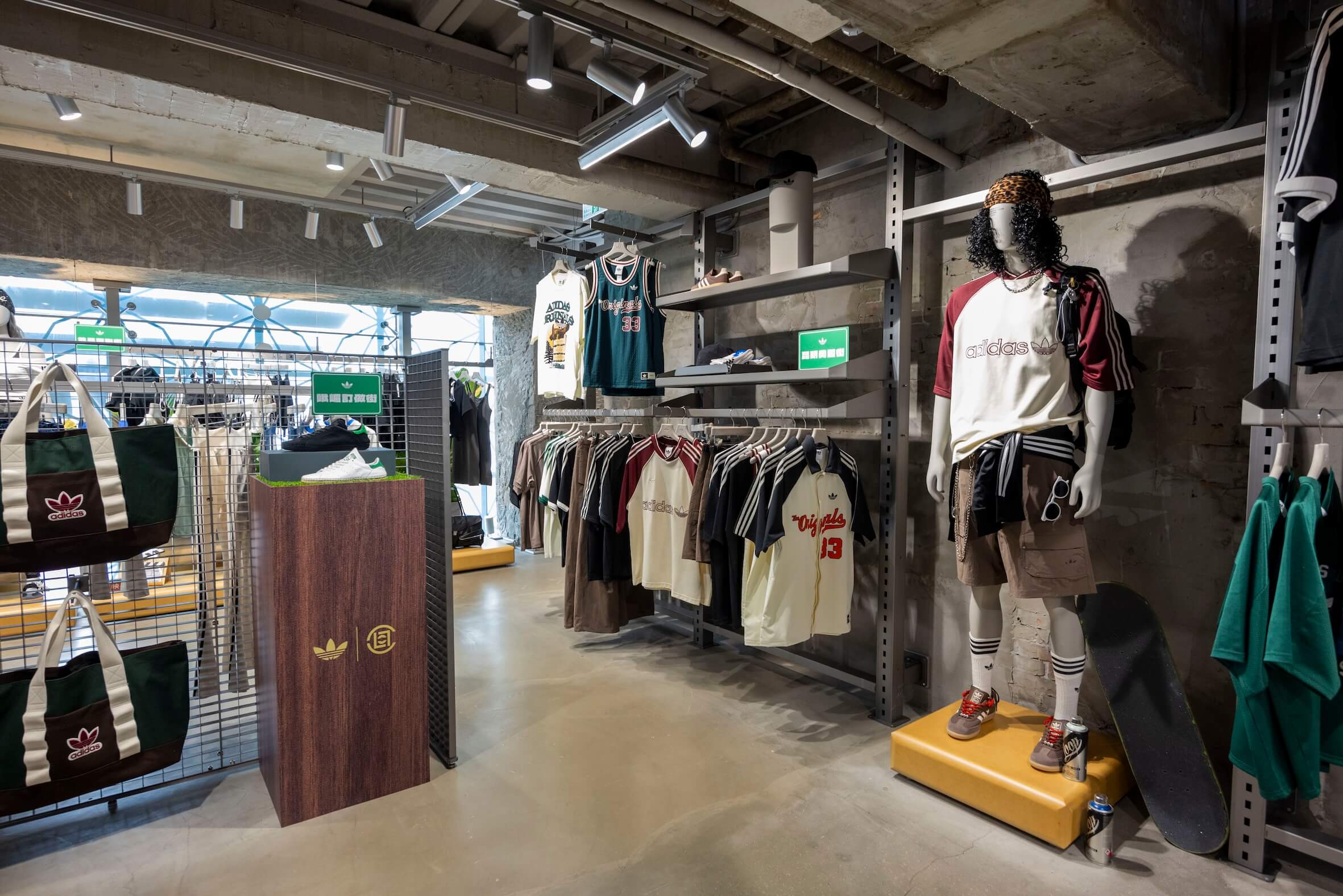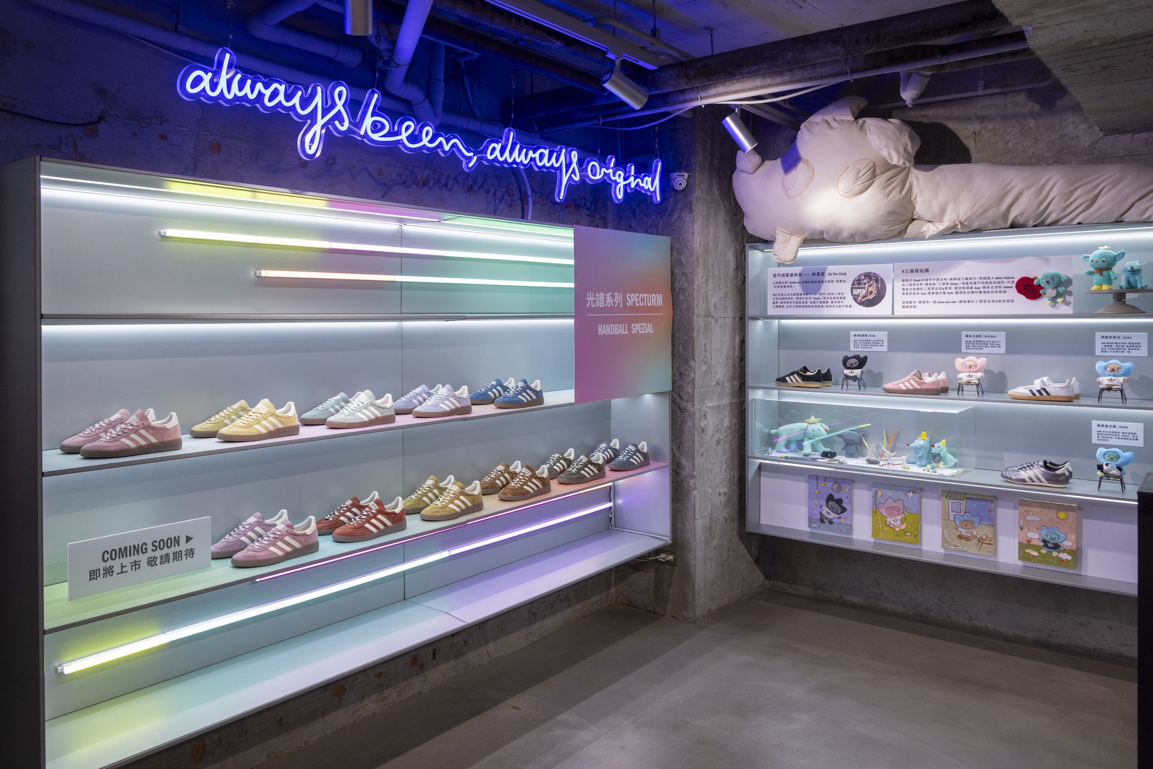 值得一提的是,3樓入口展區於開幕期間特別規劃兩區鞋款藝術展示。adidas Originals 攜手插畫藝術家林彥良,由原創角色「夢想犬 Cloudy」衍伸設計的「三葉草小夥伴 」玩偶掛飾,推出四種不同風格角色:潮流街頭黑Gaga、韓系女孩粉Ballball、柔軟奶茶米Sasa、經典復古藍Dodo(西門經典限定色)四色亮相,各自象徵不同風格的三葉草女孩與男孩,搭配藝術家畫作、草稿與設計故事陳列,為空間注入陪伴感與童趣,也凸顯adidas Originals致力以原創力結合在地藝術與潮流精神。