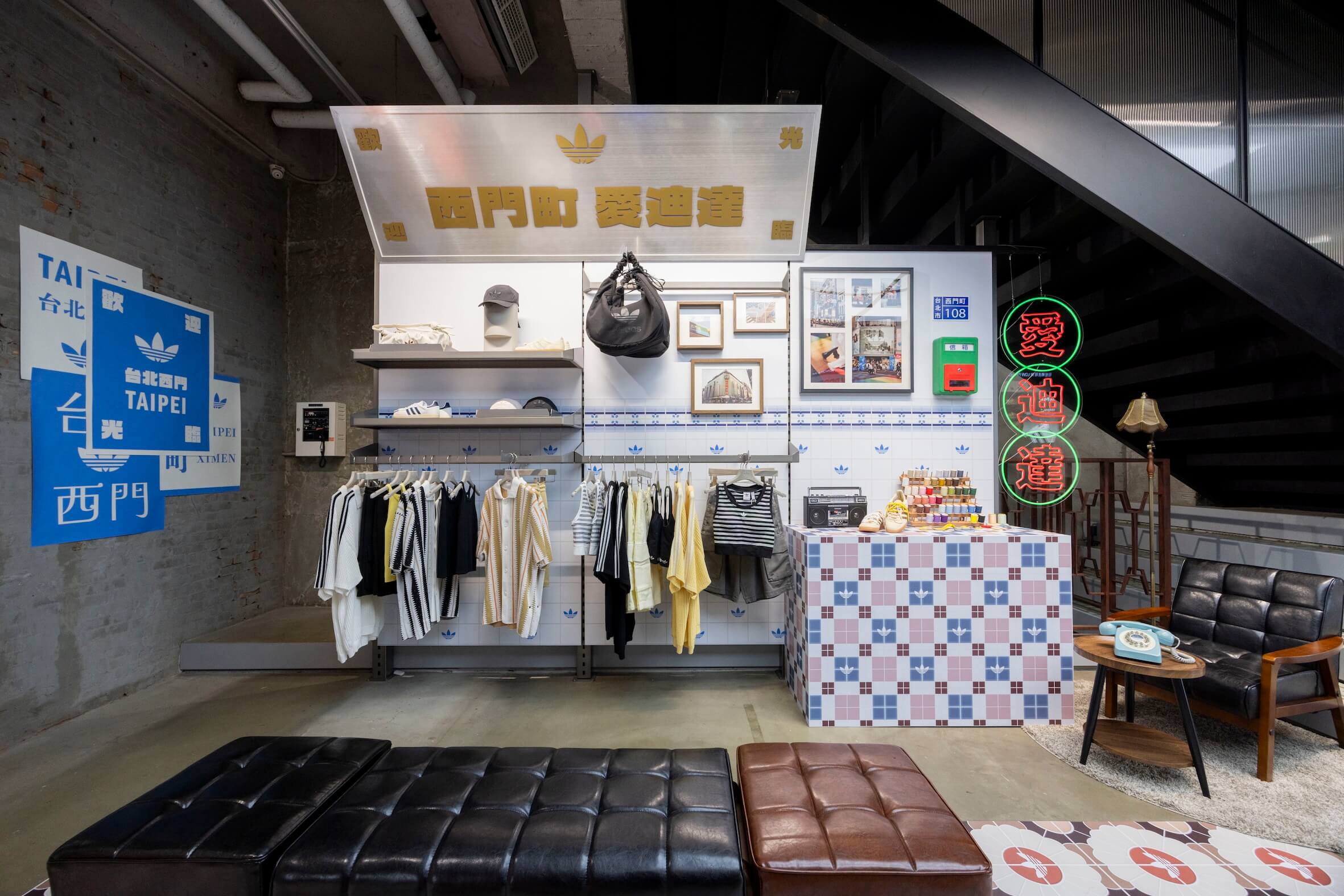 一樓空間,以花磚,街景、LED、招牌、門牌等點綴空間勾勒出熟悉的西門記憶,化身為「愛迪達修改店」,同時以夏日旅行為主題的陳列服飾,呈現多款充滿度假氣息的服飾單品,包括針織度假與暖陽度假系列,為夏季出遊提供完美穿搭提案。