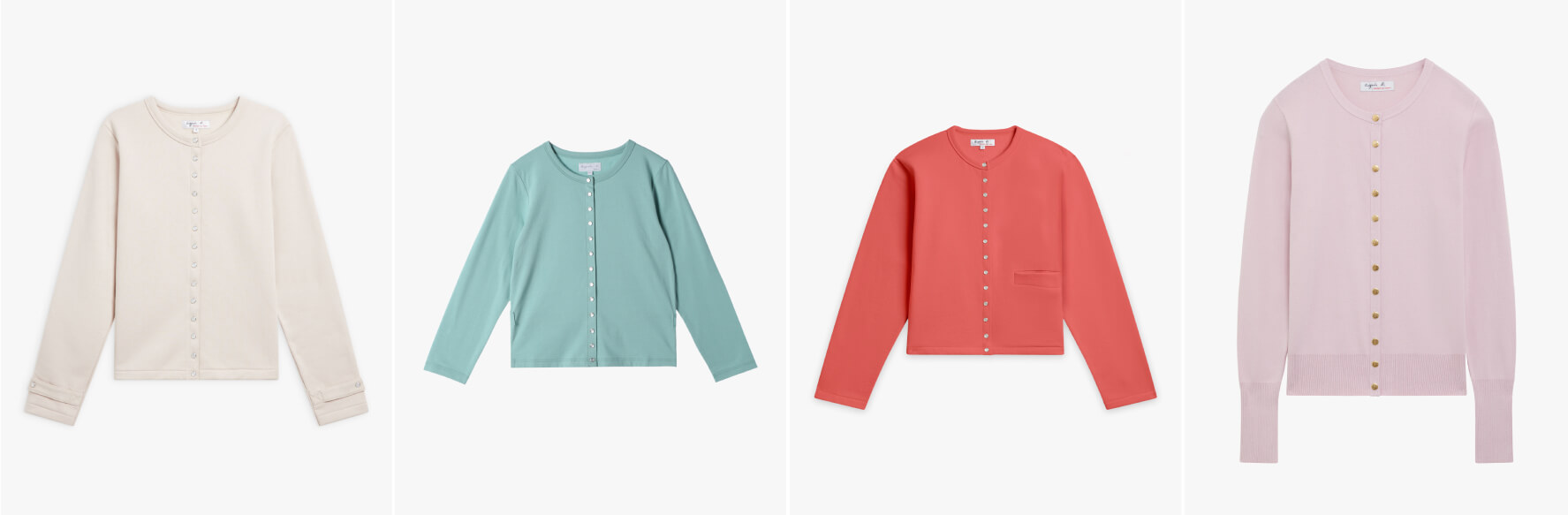 設計師以厚實的棉絨為面料,再將版型重新潤飾,於後側加上可調節腰身鬆緊度的襻扣,釘釦選用優雅的珍珠母貝材質,令Snap Cardigan樣式別具文藝復興時期的復古氣息。當時Agnès女士最喜愛的搭配方式,即是在Snap Cardigan內著白色襯衫,外面罩上西裝外套,如同三件式套裝般,打造復古又隨性的法式經典造型。