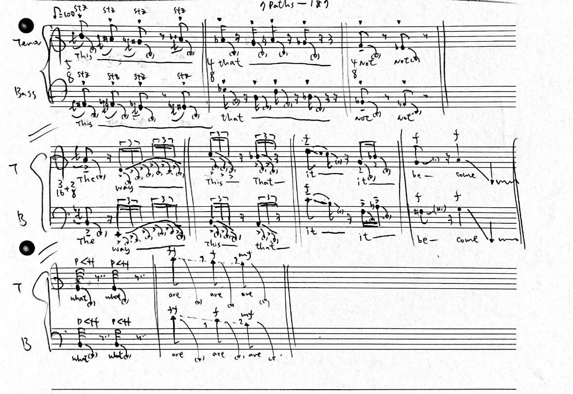 來自斯圖加特當代人聲團與比利時強音當代古典樂團 Ictus Ensemble 的錄音素材,先被拆解、再被重新編排進場域裡,等著人的動作把它們重新接起來。對於演出的感受可能很直接,靠的不是技巧展示,而是作為觀眾把身心靈進入空間後留下的反應。