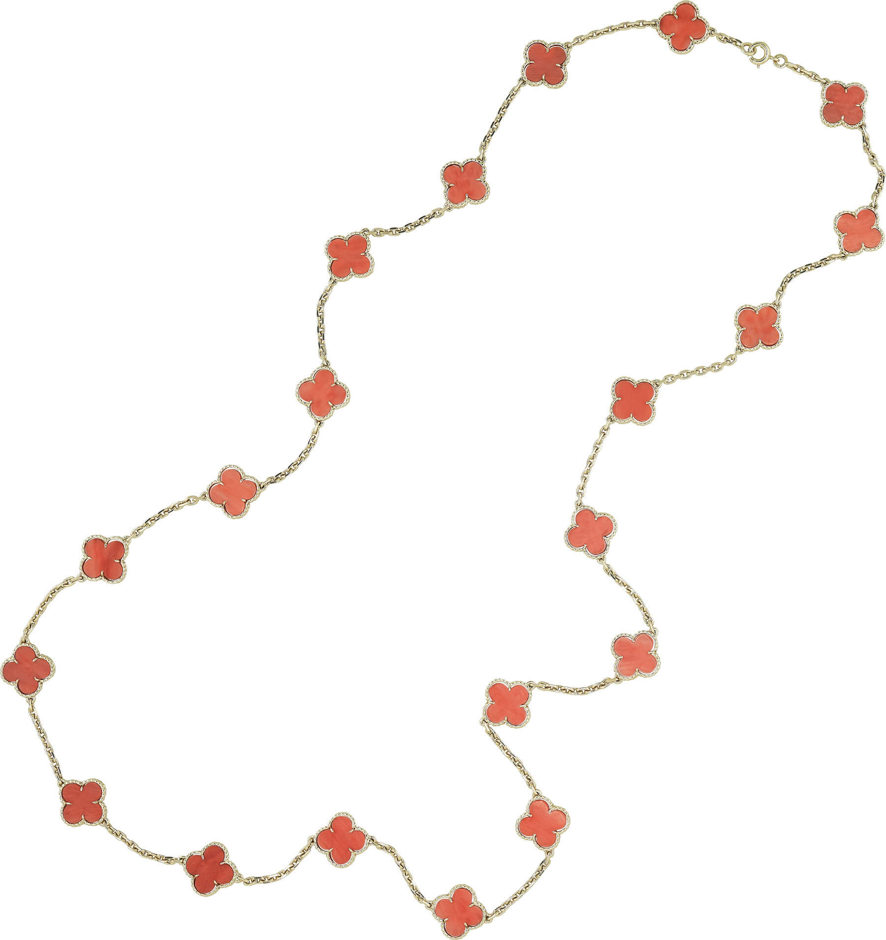 Alhambra 長項鍊,黃K金,鑲嵌20枚珊瑚幸運草圖騰墜飾。