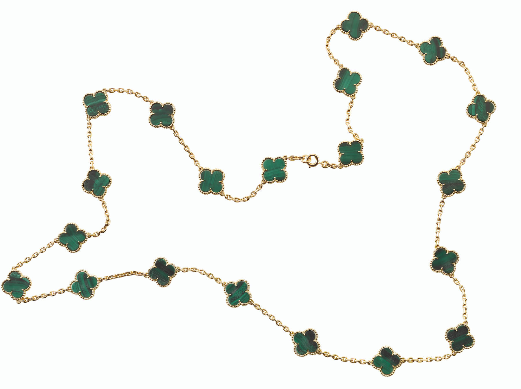 Alhambra 長項鍊,黃K金,鑲嵌20枚孔雀石幸運草圖騰墜飾。