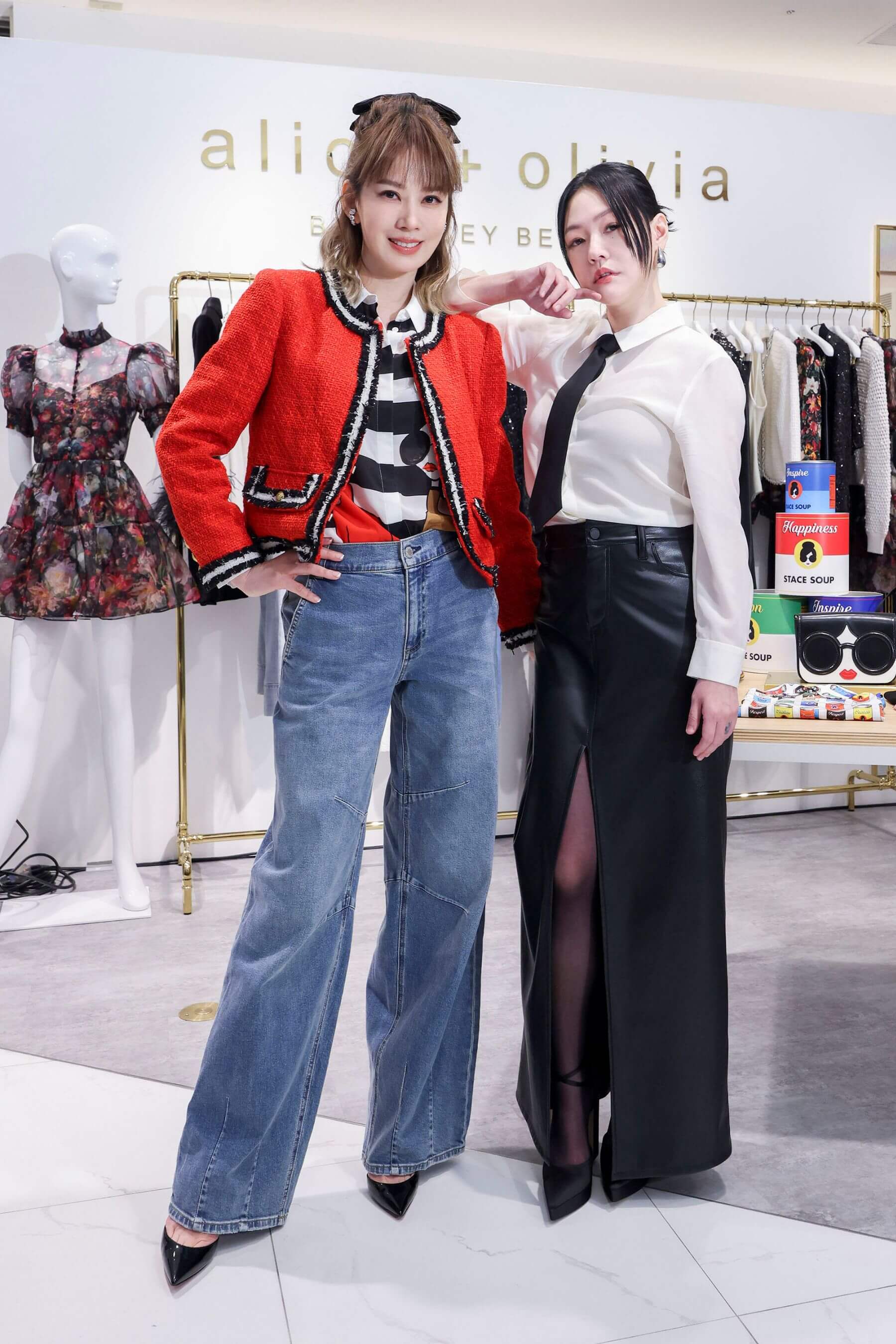 而這次小S和Melody穿著精心挑選與搭配的alice + olivia服裝,分別演繹2023秋冬系列兩大時尚特色:Minimalist Glamour與American Icons。小S身著略為Oversize的絲質襯衫,配上正面開高岔的黑色純素雲朵皮革長裙,以簡約的輪廓、精美的細部剪裁,呈現出極簡的低調奢華。Melody則以做工精緻奢華的紅色毛呢外套,搭配闊腿丹寧褲打造完美比例,紅白藍的色彩組合非常亮眼,隨興中又帶著高端的時尚風格。